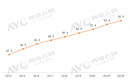 奥维云网的数据显示,自2014年以来,国内电视市场的平均尺寸持续增长,从2014年的42.2寸增长至2021年54.4寸,预计2022年平均尺寸将达55.9寸,70+和80+的大尺寸市场正迎来蓬勃发展期。