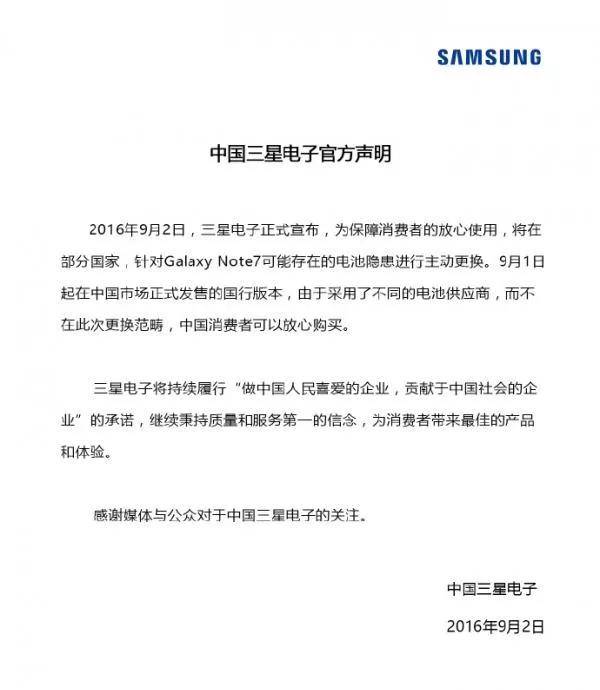 同年9月,三星开始召回Galaxy Note7,同时发布公告称在中国地区发售的手机因电池供应商不同,所以不需要召回修复,这个看似简单的声明引发了无限的讨论。