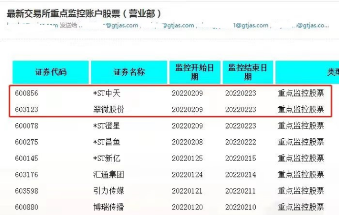《红周刊》记者获得的一份国泰君安内部风控邮件显示,近期多只涨跌异常的个股可能已被上交所重点监控,具体涉及*ST中天(600856.SH)、翠微股份(603123.SH)、*ST澄星(600078.SH)、*ST昌鱼(600275.SH)、*ST新亿(600145.SH)、引力传媒(603598.SH)、博瑞传播(600880.SH)等个股。