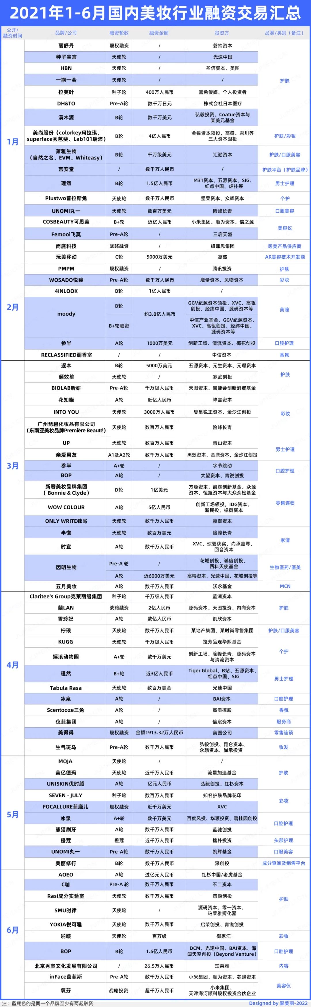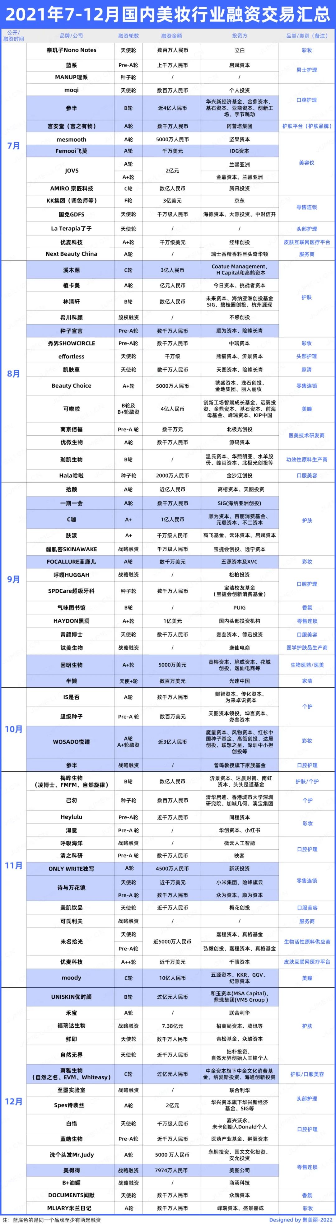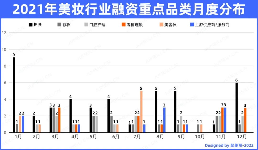 挑选一些重点品类按月来看,护肤、彩妆和口腔护理赛道基本每月都有融资发生。以下,根据各个品类,我们分别展开详细分析: