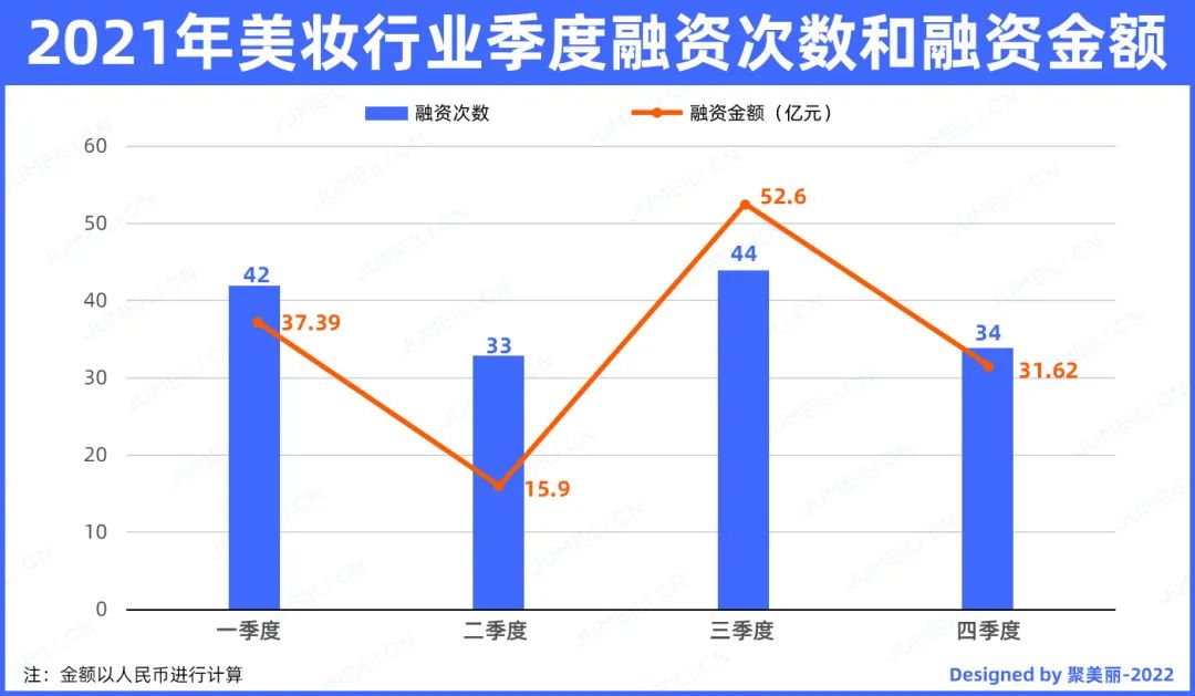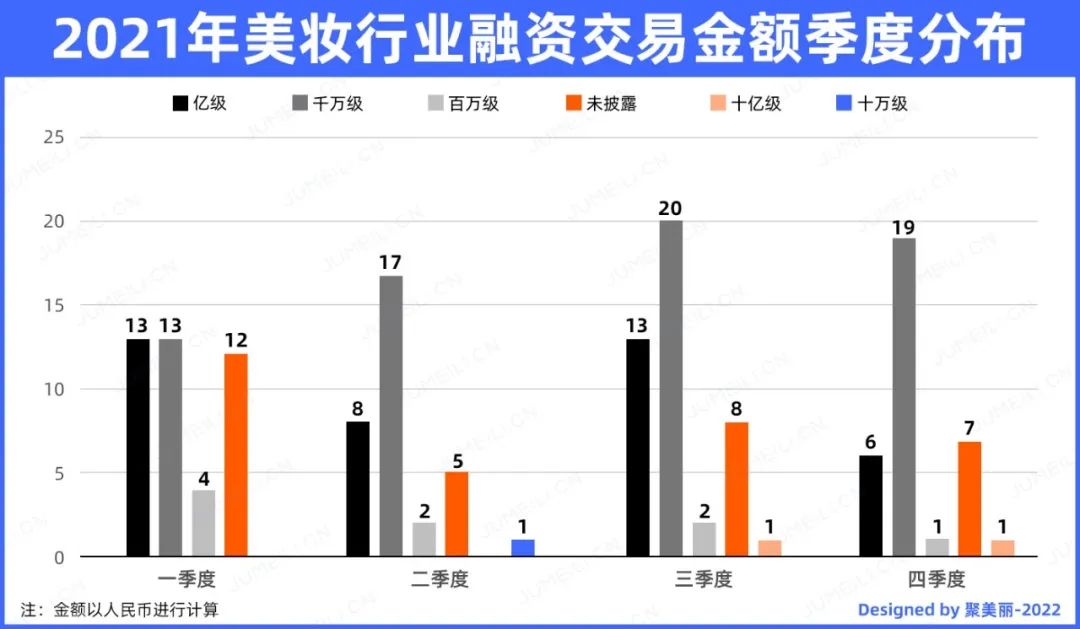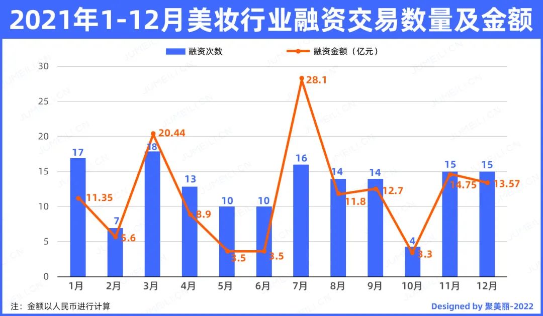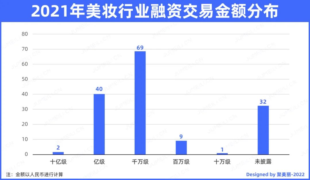 据聚美丽不完全统计,2021年全年国内美妆行业发生了共153起投融资交易,据粗略估计,已披露金额的121起交易融资总金额超137亿元人民币。