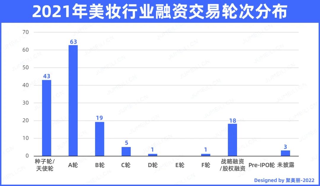 从融资次数看,除了2月和10月比较低迷外,其他各月的融资交易数量分布较为均匀。而同时参考融资金额,会发现化妆品行业似乎在5月和6月以及10月出现降温,但随后一个月的数据又会反升得到一个小高潮,可以看出资本市场的关注又逐渐在回温。