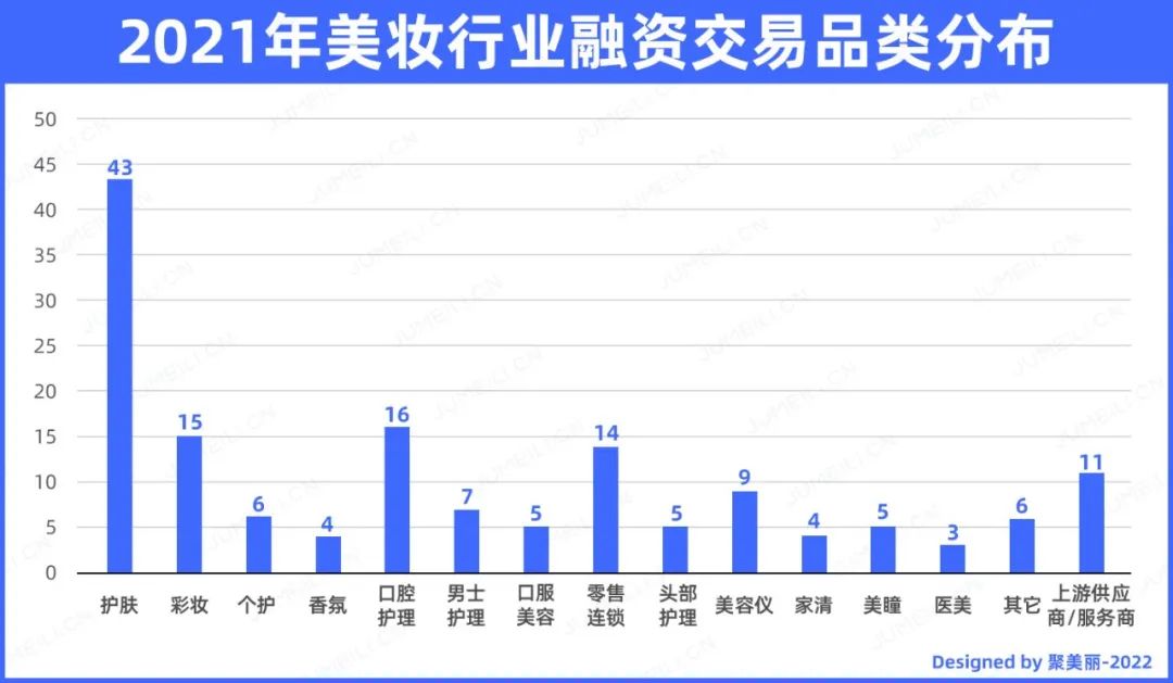 按品类分析,可以看到2021年这一整年内,护肤这一赛道是资本的关注重点,在这个主力品类里共发生了43起融资交易,占比约为30%。