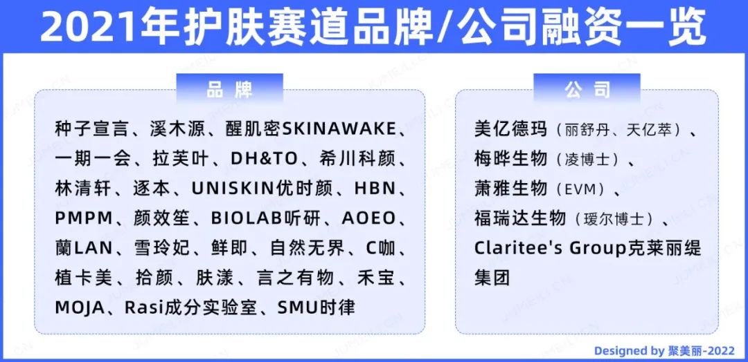 按下图显示,在护肤这一主力品类中,如下品牌和公司在2021年获得了融资。其中,绝大部分的护肤品牌围绕“功效”这一关键开发产品。