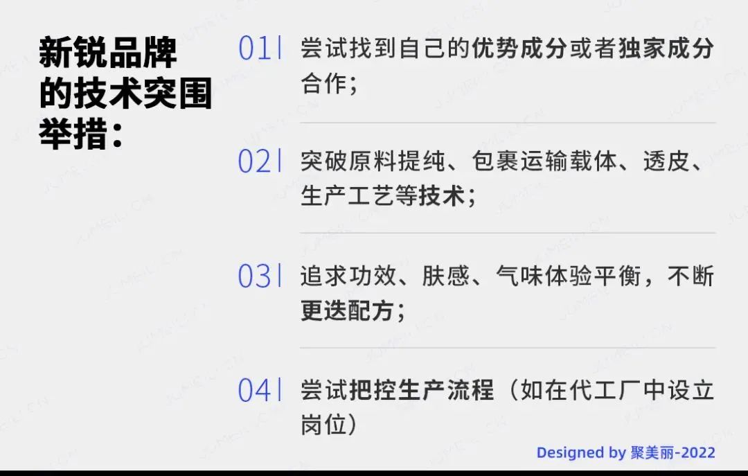 可以看到,新锐品牌们越来越重视技术与科研,一批新锐品牌无一例外在“原研成分+精妙配方+创新工艺”方面做出了坚实的差异化,并且开始挖掘更具体和细分的科研优势,如在原料提纯、包裹运输载体、透皮、生产工艺等的综合技术,或者在更加追求功效、肤感、气味体验平衡的精妙配方。