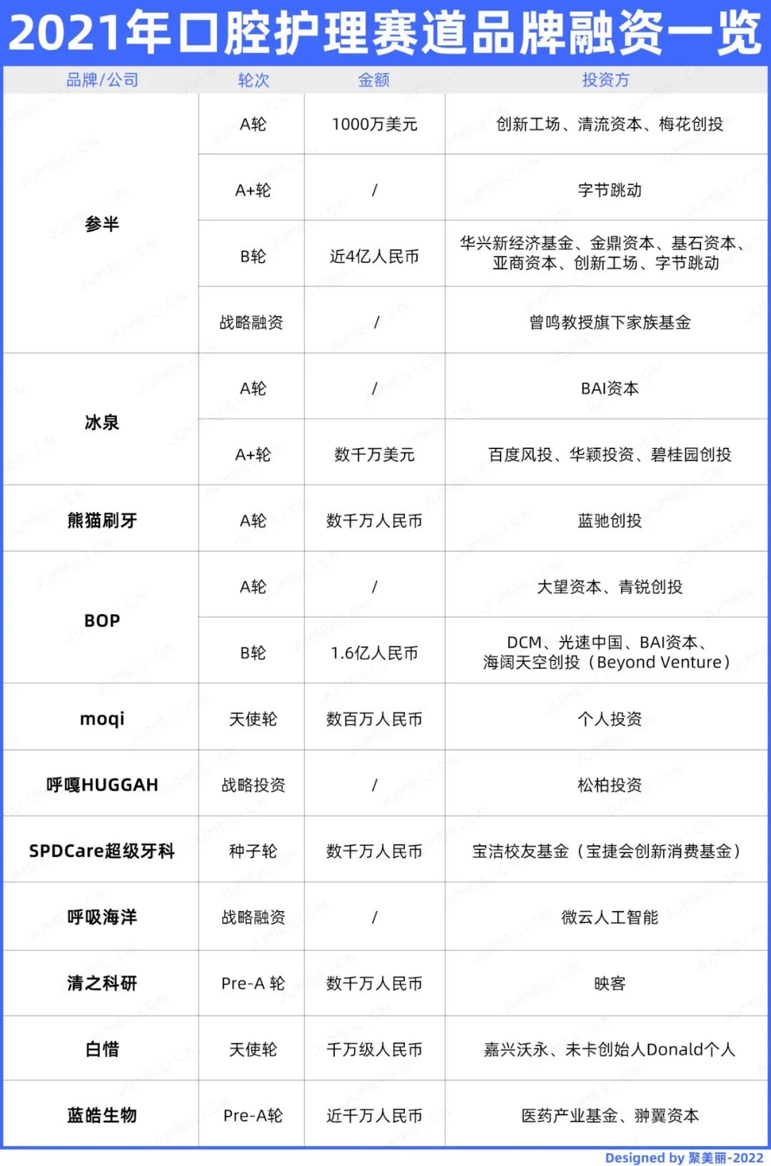 在口腔消费品的融资交易中,上半年BOP、冰泉在7个月内完成两轮融资,参半甚至拿到四轮融资。下半年,也有更多新锐口腔护理品牌拿到融资,如呼嘎、清之科研、呼吸海洋等等。