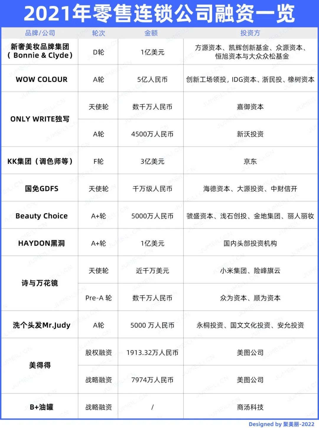 在零售连锁领域,2021年共发生14起融资交易。无论是我们所熟知的THE COLORIST调色师、WOW COLOUR这些较早期成立的彩妆集合店,还是更为年轻的新锐零售品牌如独写、黑洞、B+油罐等后起之秀们,都榜上有名。