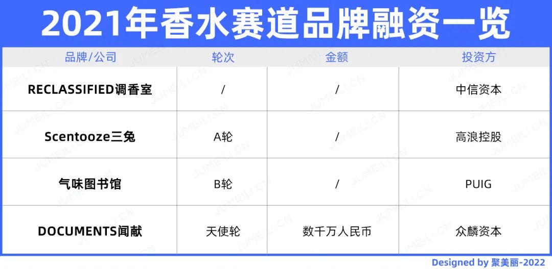 虽然在2021年这一赛道仅发生4起融资,但其中值得一提的是,国货香水的“老大哥”气味图书馆获得PUIG的投资。