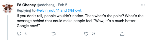 网友Ed直接指出:如果你不说,人们不可能发现这个变化。所以这有什么意义呢?到底这背后有什么值得人们感叹“哇塞,谷歌更好了?”的设计元素呢?
