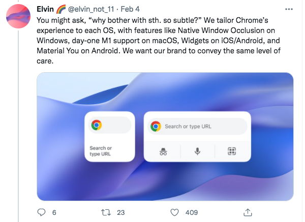 当人们纷纷在网上玩“大家来找茬”的时候,谷歌Chrome这次Logo背后设计团队的一位设计师Elvin Hu站出来在Twitter上洋洋洒洒写了非常多关于这次设计的巧思: