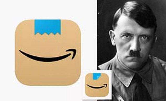 最近一次翻车事故就来自亚马逊。 当时这款突然一夜之间上新的Logo,先是撞脸希特勒,后来为了补救,愣是用一个翻起来的贴纸逼疯了一大众强迫症。