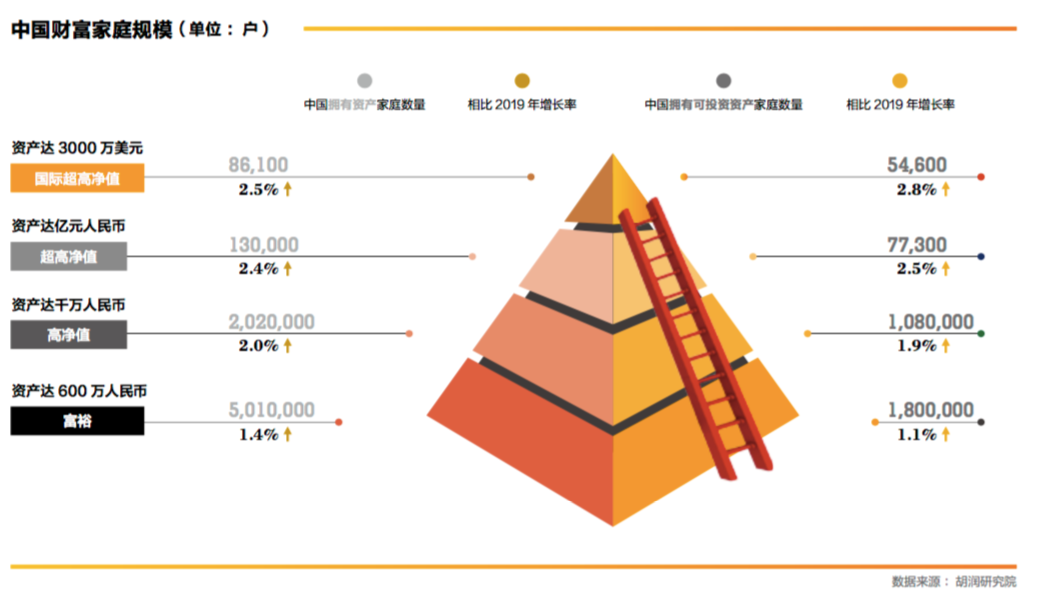 根据胡润《2021中国高净值人群财富风险管理白皮书》,在中国,有600万人民币家庭净资产的“富裕家庭”达501万户;有千万人民币家庭净资产的“高净值家庭”202万户;有亿元人民币家庭净资产的“超高净值家庭”13万户,有亿元人民币可投资资产的“超高净值家庭”7.7万户;3000万美元可投资资产的“国际超高净值家庭”5.4万户。