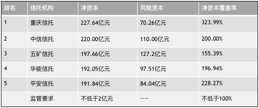 截至2020年末,信托公司净资本排名前五名分别为重庆信托、中信信托、五矿信托、华能信托、平安信托,除了平安信托(背后的中国平安处于无实际控制人状态)外,其它四家皆有着清晰的国资背景。