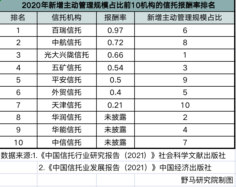 为此,我们抓取了2020年新增主动管理类信托规模前十的机构,对其信托报酬率进行对比。通过对比发现,百瑞信托、中航信托、光大兴陇信托、五矿信托、平安信托分别列入上述前十机构的信托报酬率前五名。意味着,2020年,这些机构,既大额提高了主动管理类信托的规模,也保证了信托报酬率,主动管理能力。
