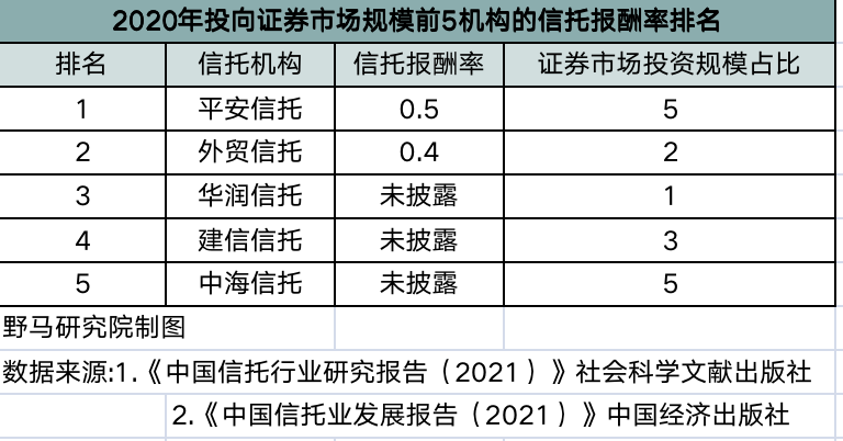 我们调取了2020年在证券市场类投资规模最大的前五家,对比其信托报酬率,不过前五家中有三家未披露相关数据,平安信托、外贸信托则分别为0.5、0.4。