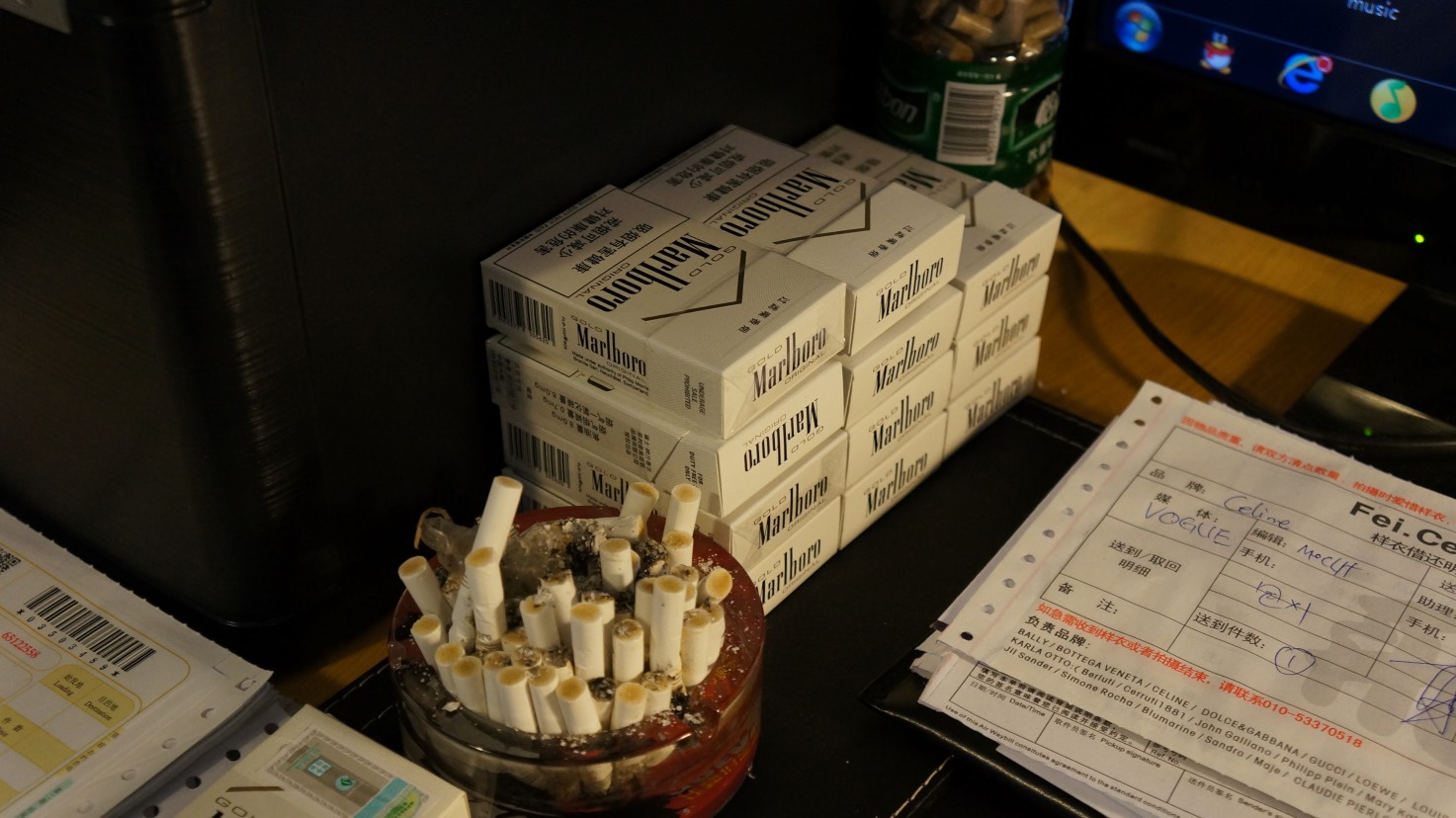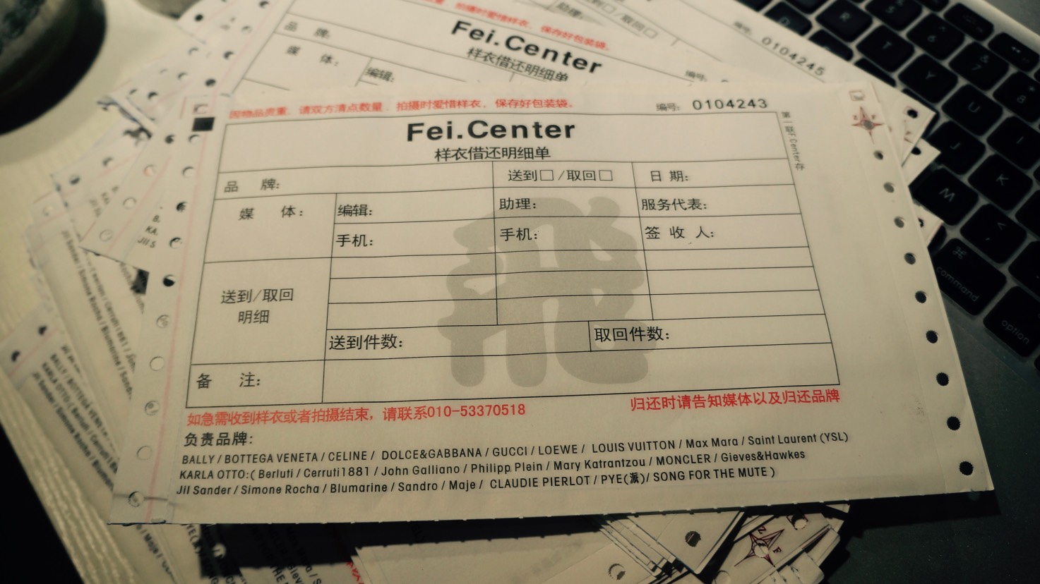 “Alice的推荐下,我接了第一个客户Loewe,他们把样衣都放在我这,编辑和经纪人跟他们邮件沟通借衣后,客户会把邮件转给我,我在从中协调怎么给人送,还有拿回来的事儿。因为也干了这些年嘛,这圈里的人都算认识,做起来也还成,当时一个月给我的服务费是5500元,我找外面开个发票花500块的点儿钱。还有你知道Fendi不是把样衣直接放在店里让店员拿给编辑嘛,结果他们丢了一次店货,店员抱怨肯定是自己去库房拿样衣时店里人员不够才闹出丢东西的,后来他们也找到我,把样衣放在我这了,我给编辑送,等他们拍完再拿回来。一茬接一茬,Dolce & Gabbana有次做新品预览,他们人手特别少,新衣服到了还得整理熨烫、按照规定搭配,根本忙不完,问我能不能来帮忙,我说可以就接着聊费用,他们说香港那边的老大决定按一天100给我,整个下来七天700块,我开始想这太低了,但琢磨下就当是赚个人情赚点名声吧”。