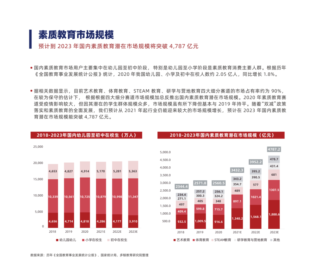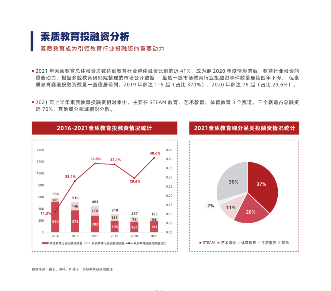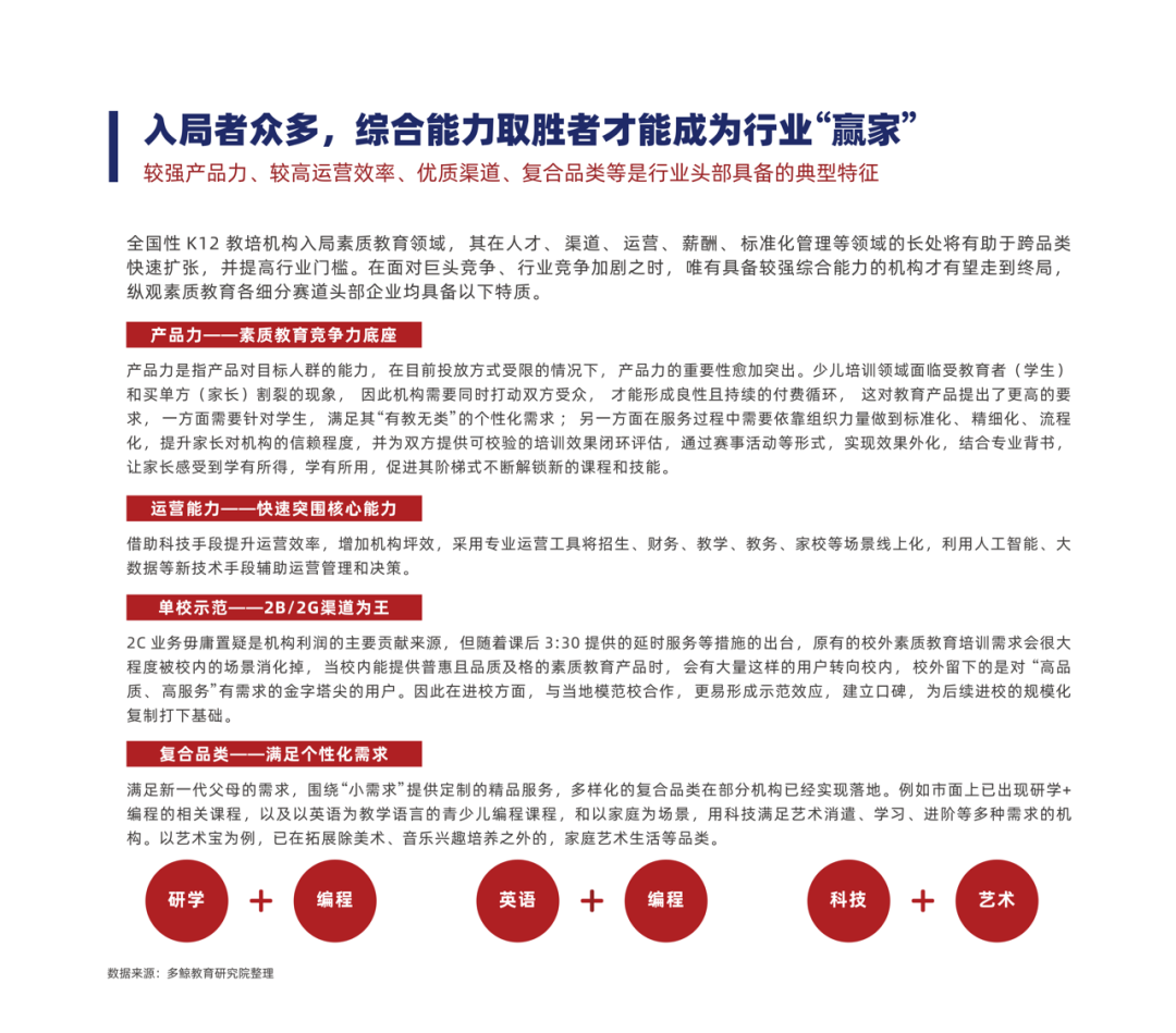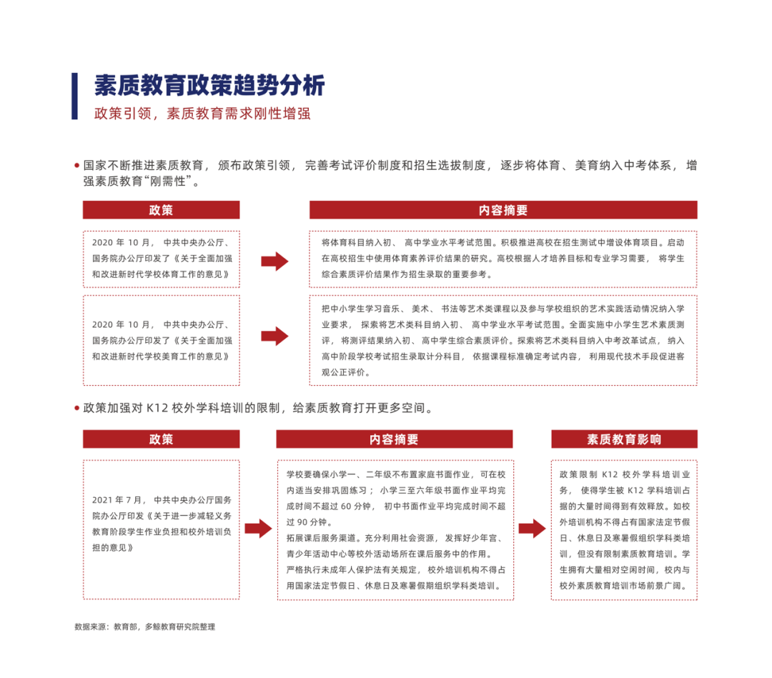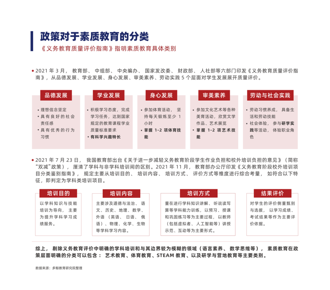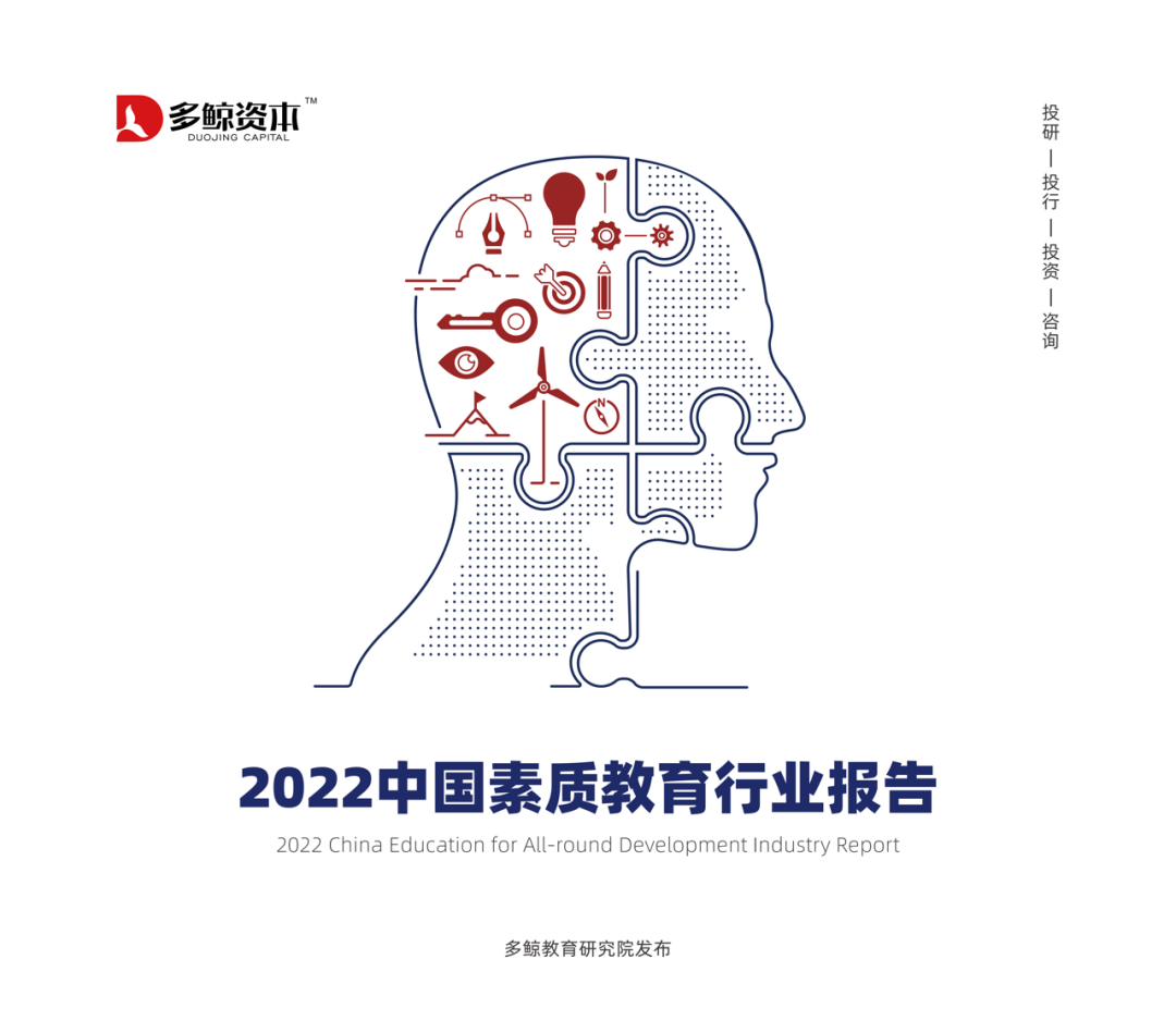 2022 年 1 月,面对行业全新阶段,多鲸教育研究院出品了《2022 中国素质教育行业报告》,报告深入研究一系列政策对素质教育行业的影响,阐明素质教育行业的驱动因素、分析商业模式、拆解产业链,并对如艺术教育、体育教育、STEAM 教育、研学与营地教育多个素质教育典型赛道进行市场特点探究、市场规模测算、竞争格局剖析和典型企业案例分析。此外,报告通过访谈多位业内专家,集素质教育公司创始人、行业投资人、券商分析师观点,多视角、多维度地预判素质教育的未来发展趋势。