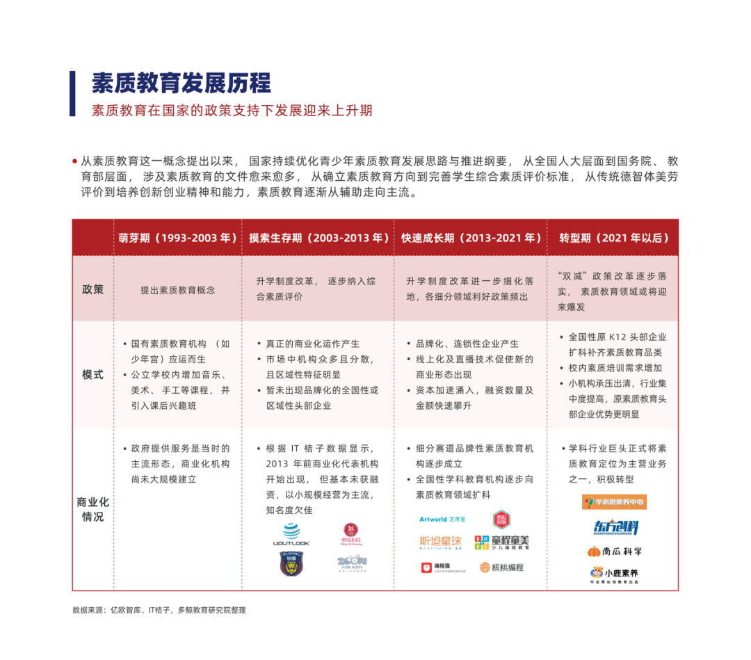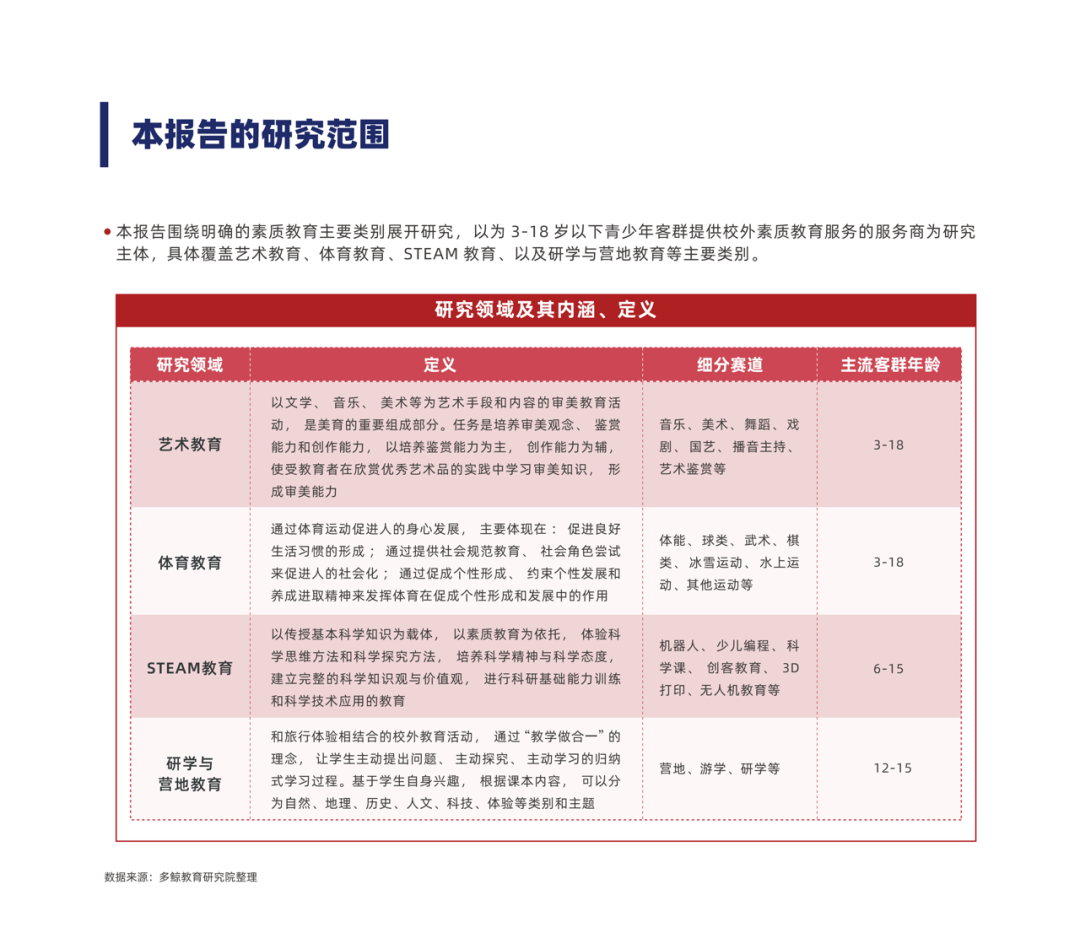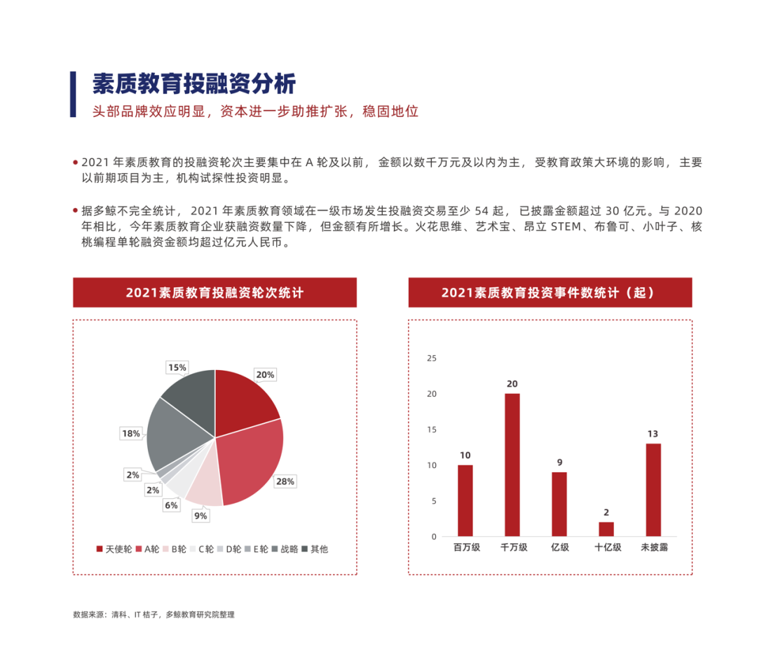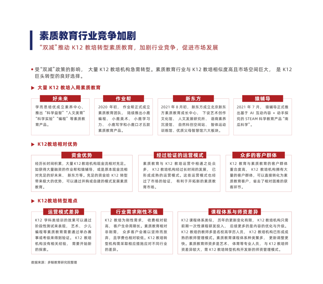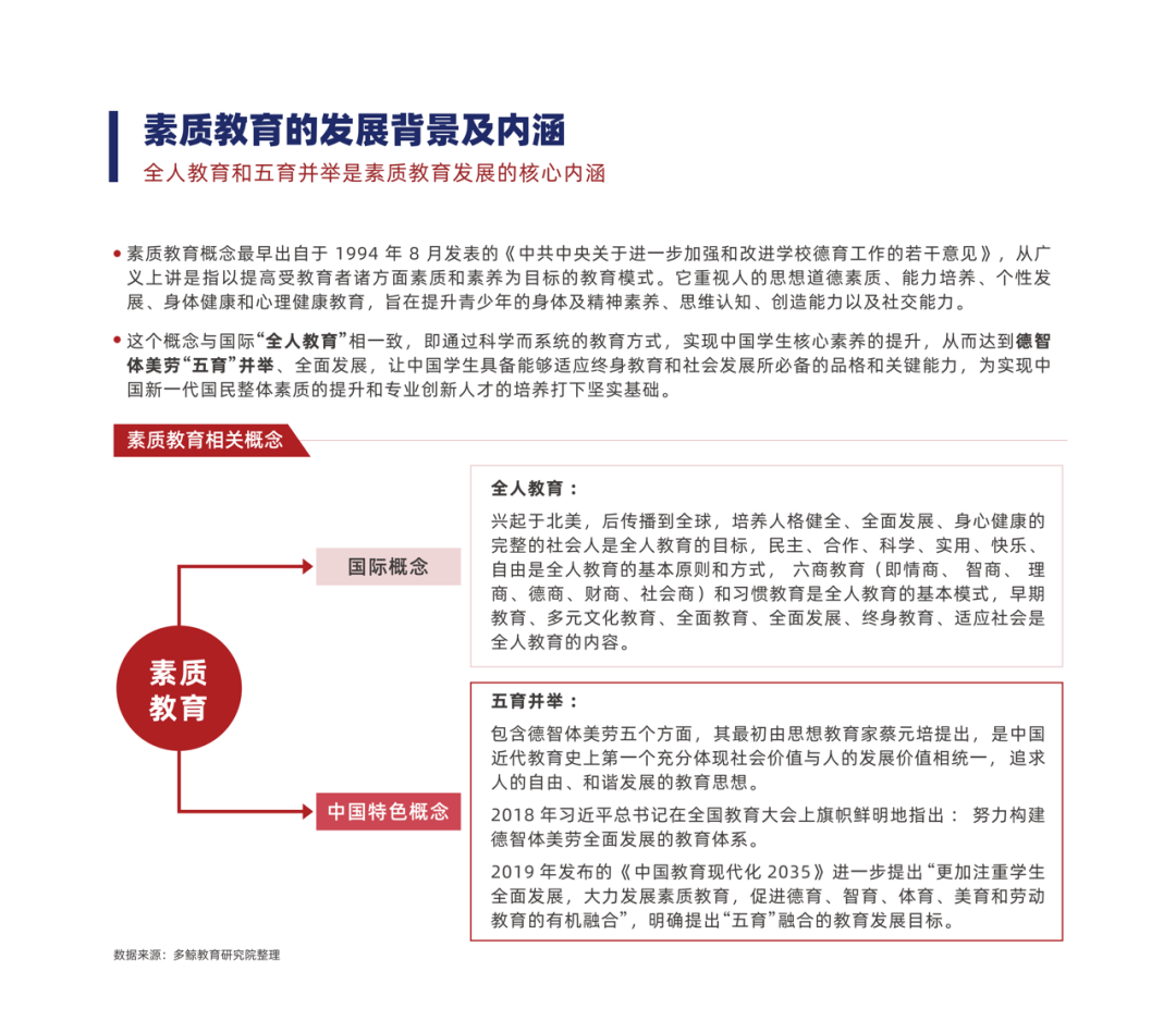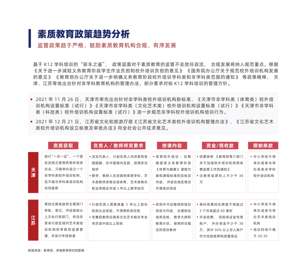 2022 年 1 月,面对行业全新阶段,多鲸教育研究院出品了《2022 中国素质教育行业报告》,报告深入研究一系列政策对素质教育行业的影响,阐明素质教育行业的驱动因素、分析商业模式、拆解产业链,并对如艺术教育、体育教育、STEAM 教育、研学与营地教育多个素质教育典型赛道进行市场特点探究、市场规模测算、竞争格局剖析和典型企业案例分析。此外,报告通过访谈多位业内专家,集素质教育公司创始人、行业投资人、券商分析师观点,多视角、多维度地预判素质教育的未来发展趋势。