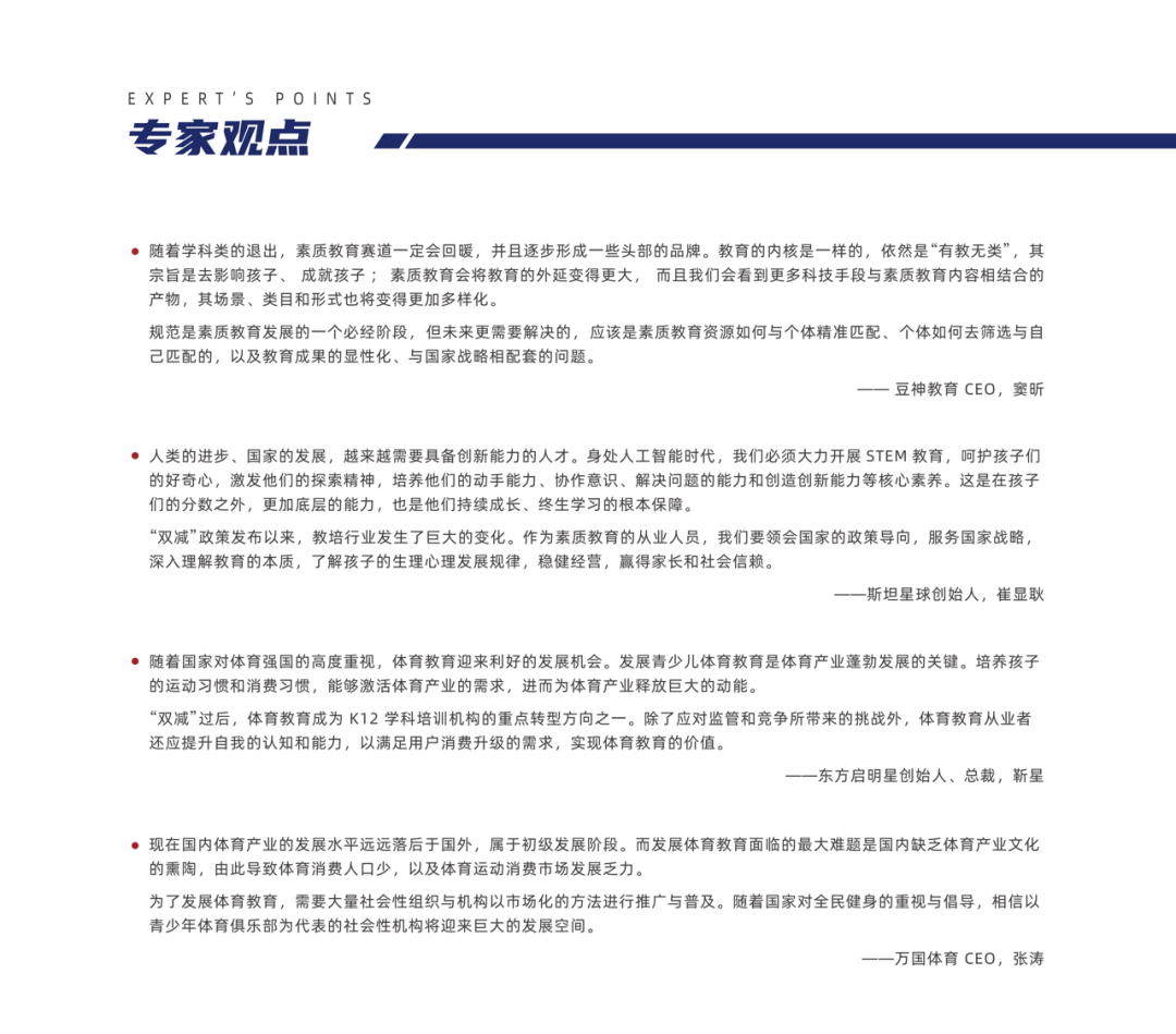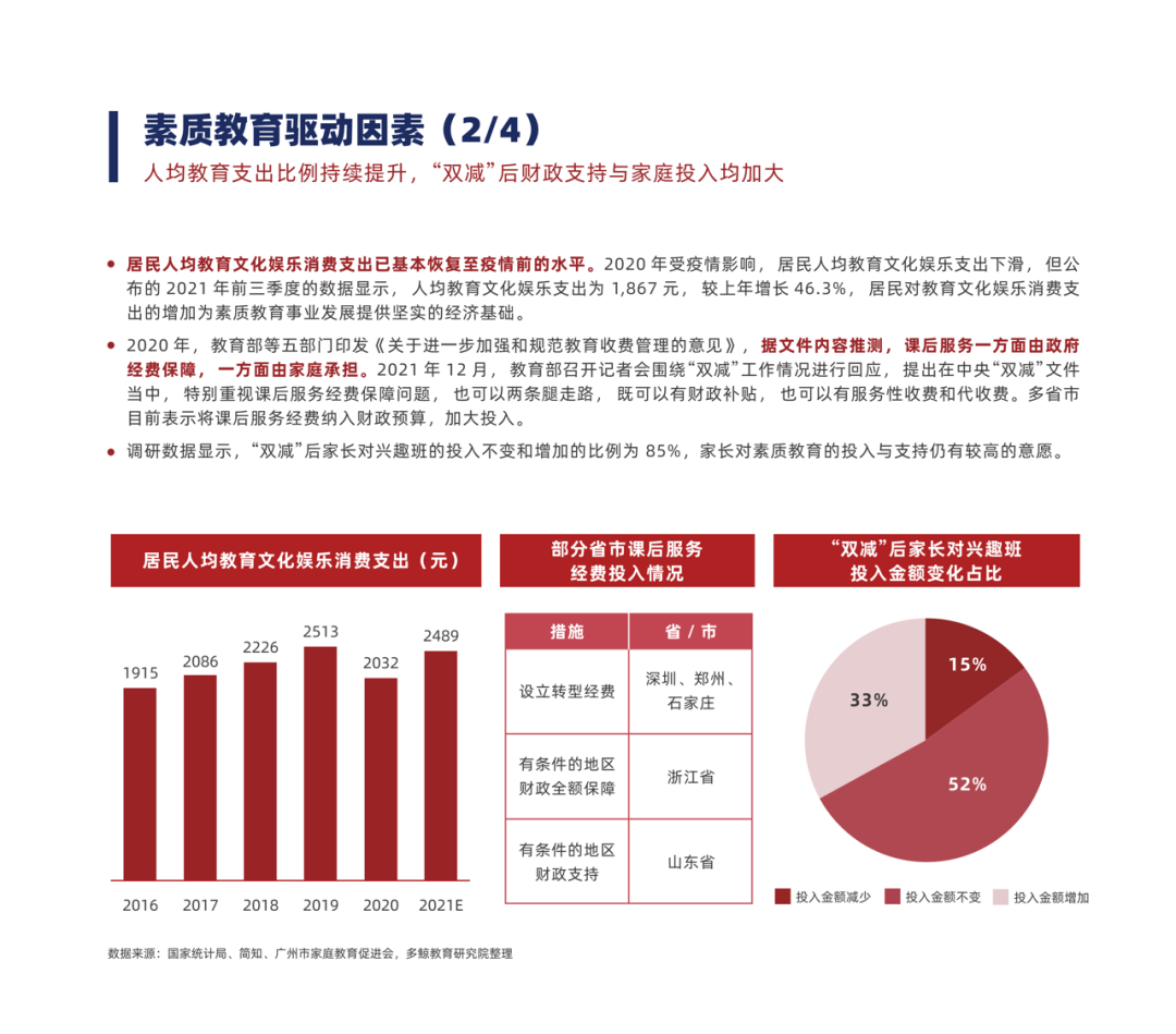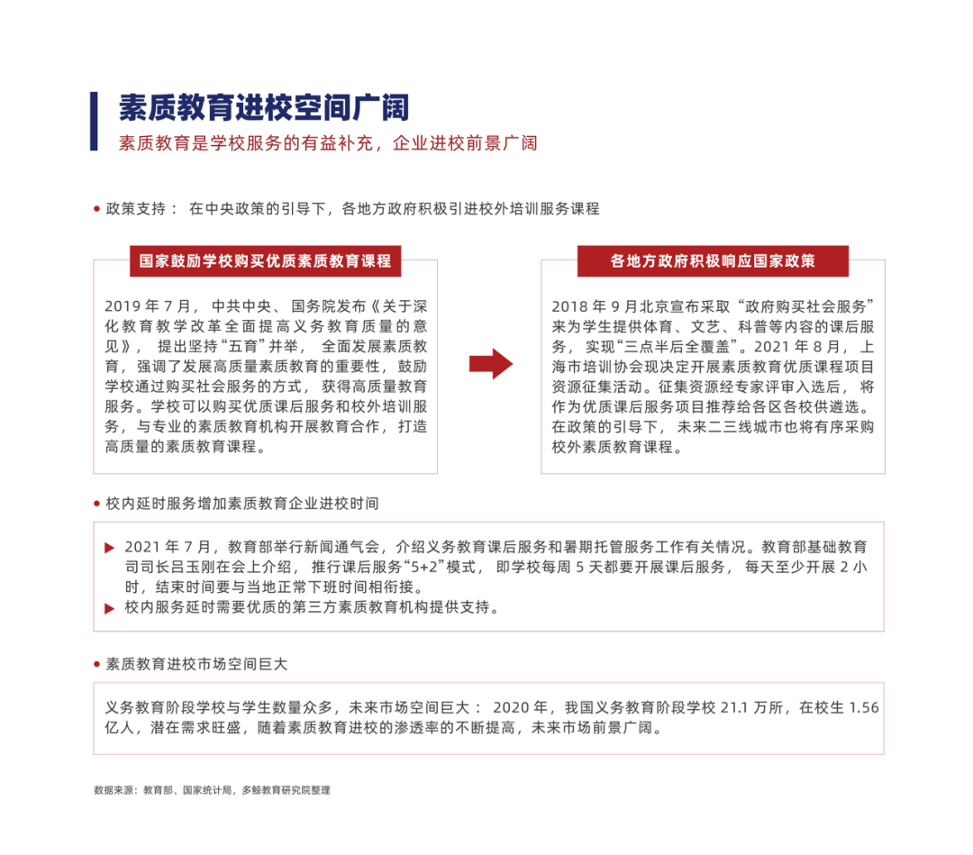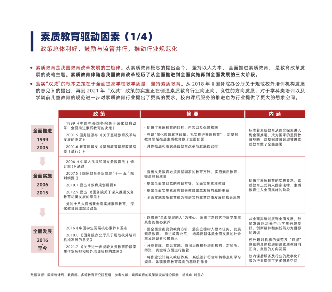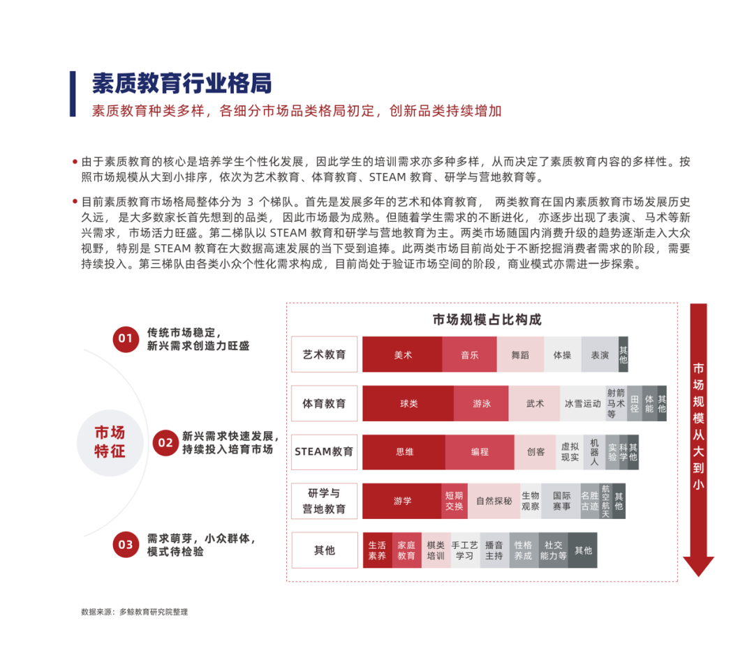 2022 年 1 月,面对行业全新阶段,多鲸教育研究院出品了《2022 中国素质教育行业报告》,报告深入研究一系列政策对素质教育行业的影响,阐明素质教育行业的驱动因素、分析商业模式、拆解产业链,并对如艺术教育、体育教育、STEAM 教育、研学与营地教育多个素质教育典型赛道进行市场特点探究、市场规模测算、竞争格局剖析和典型企业案例分析。此外,报告通过访谈多位业内专家,集素质教育公司创始人、行业投资人、券商分析师观点,多视角、多维度地预判素质教育的未来发展趋势。