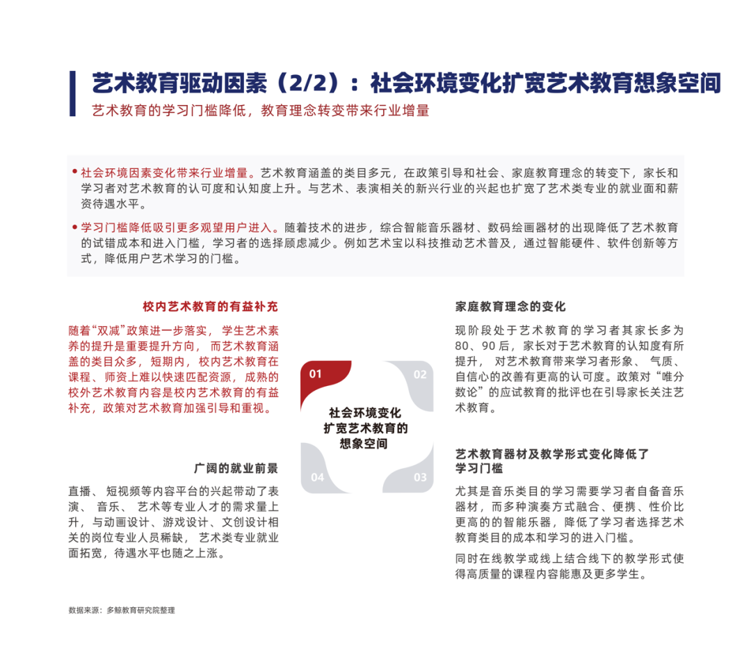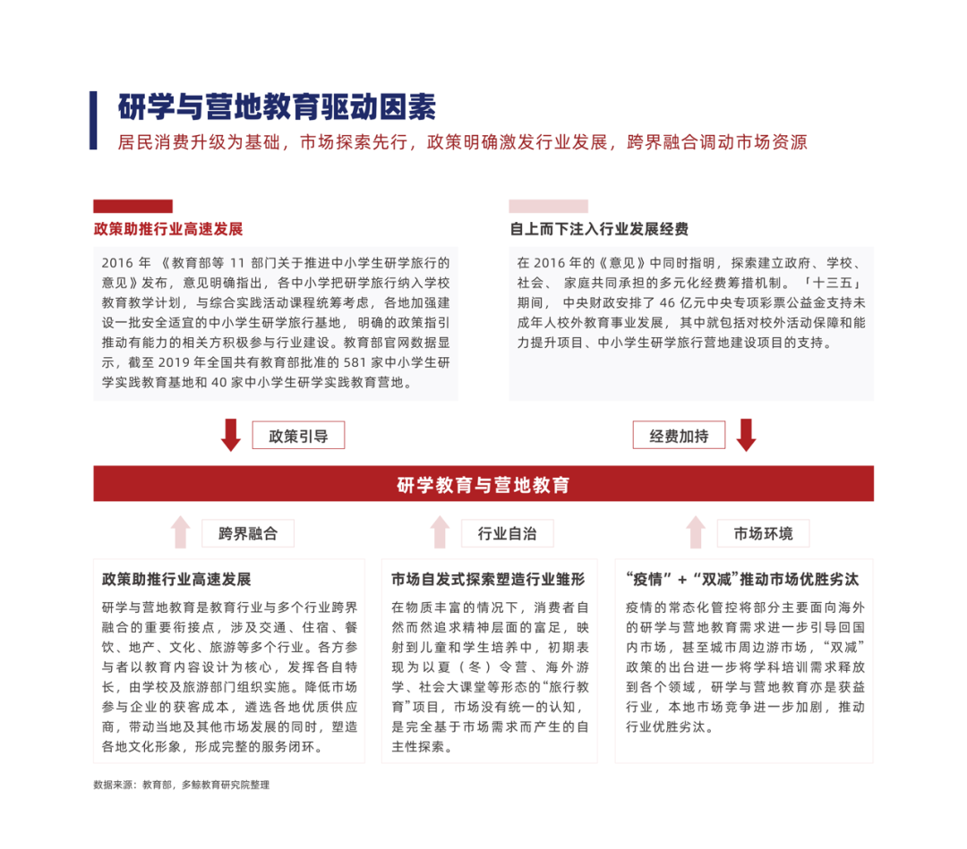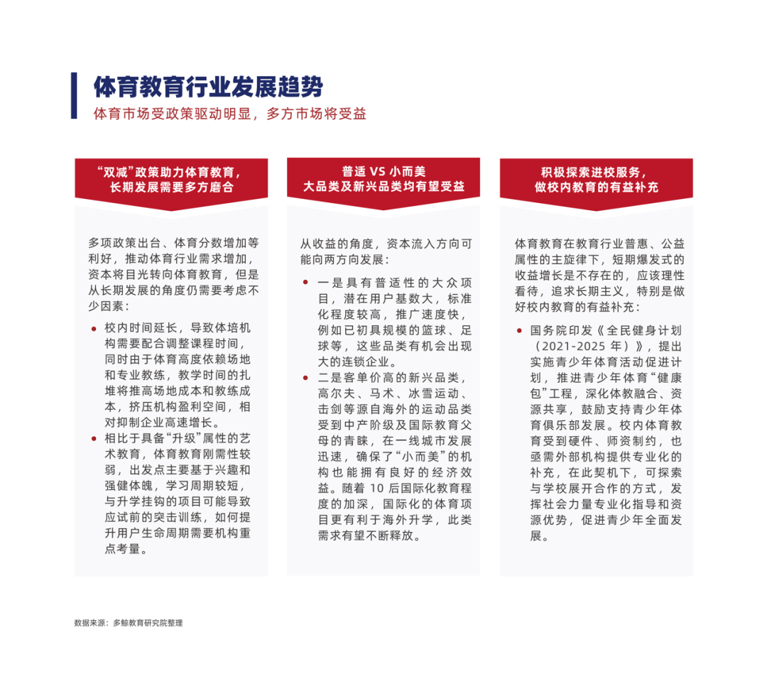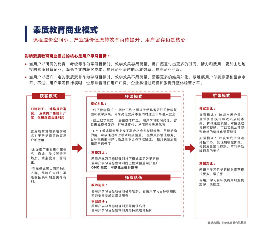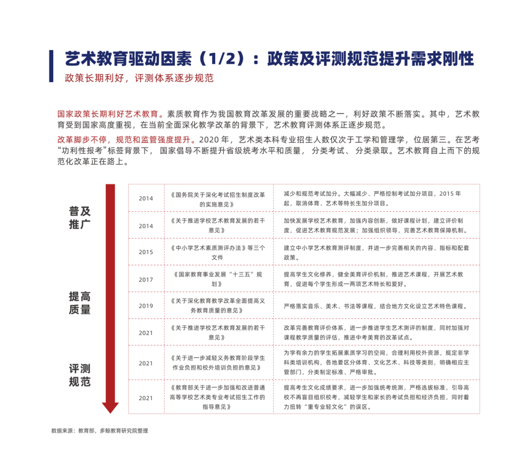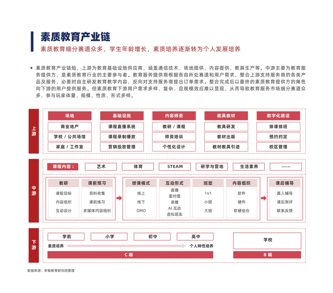 2022 年 1 月,面对行业全新阶段,多鲸教育研究院出品了《2022 中国素质教育行业报告》,报告深入研究一系列政策对素质教育行业的影响,阐明素质教育行业的驱动因素、分析商业模式、拆解产业链,并对如艺术教育、体育教育、STEAM 教育、研学与营地教育多个素质教育典型赛道进行市场特点探究、市场规模测算、竞争格局剖析和典型企业案例分析。此外,报告通过访谈多位业内专家,集素质教育公司创始人、行业投资人、券商分析师观点,多视角、多维度地预判素质教育的未来发展趋势。