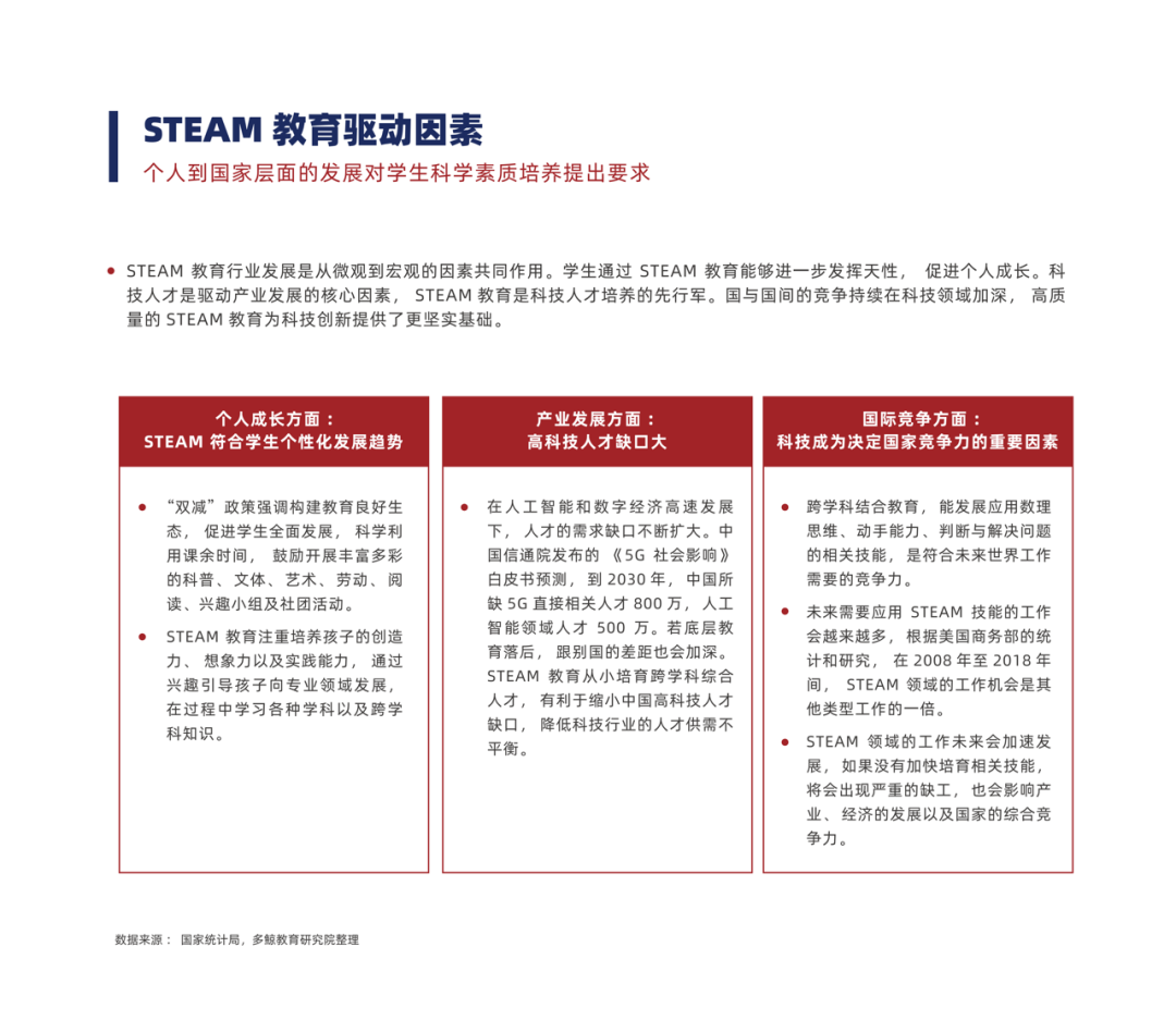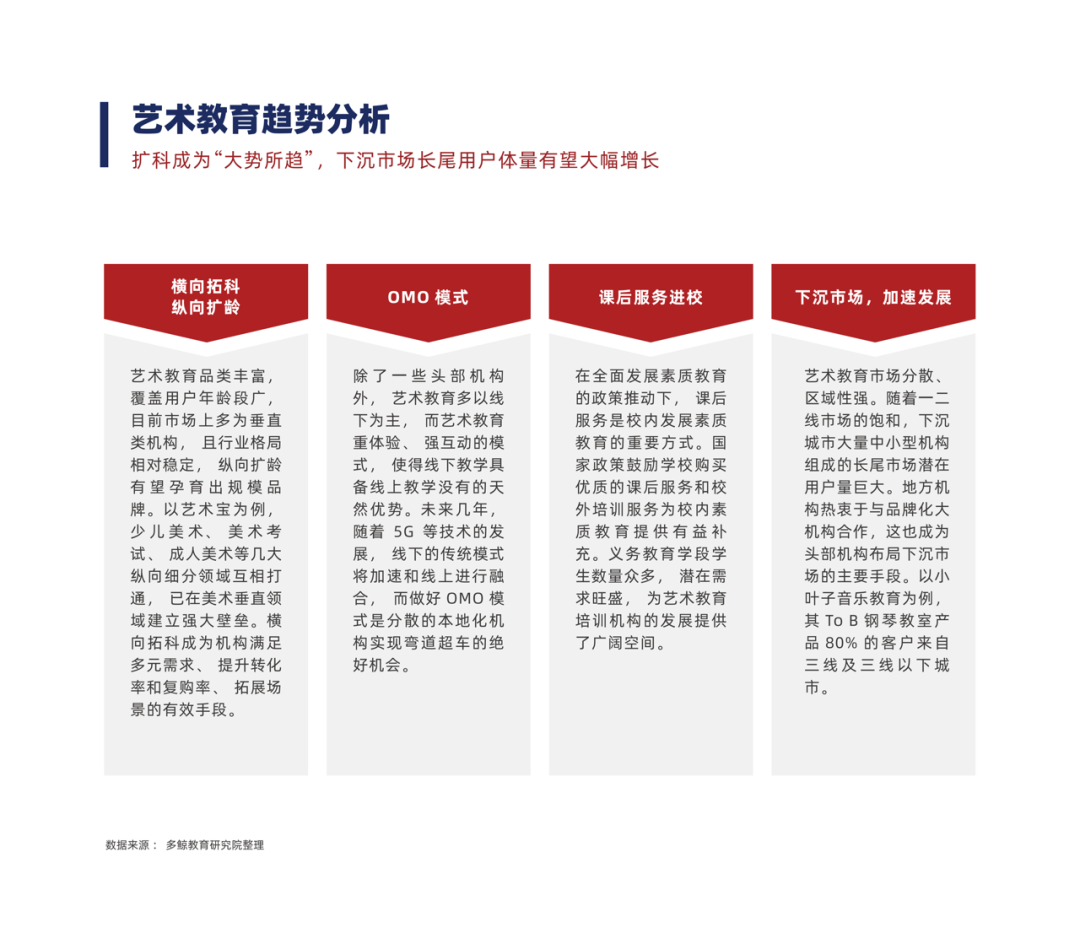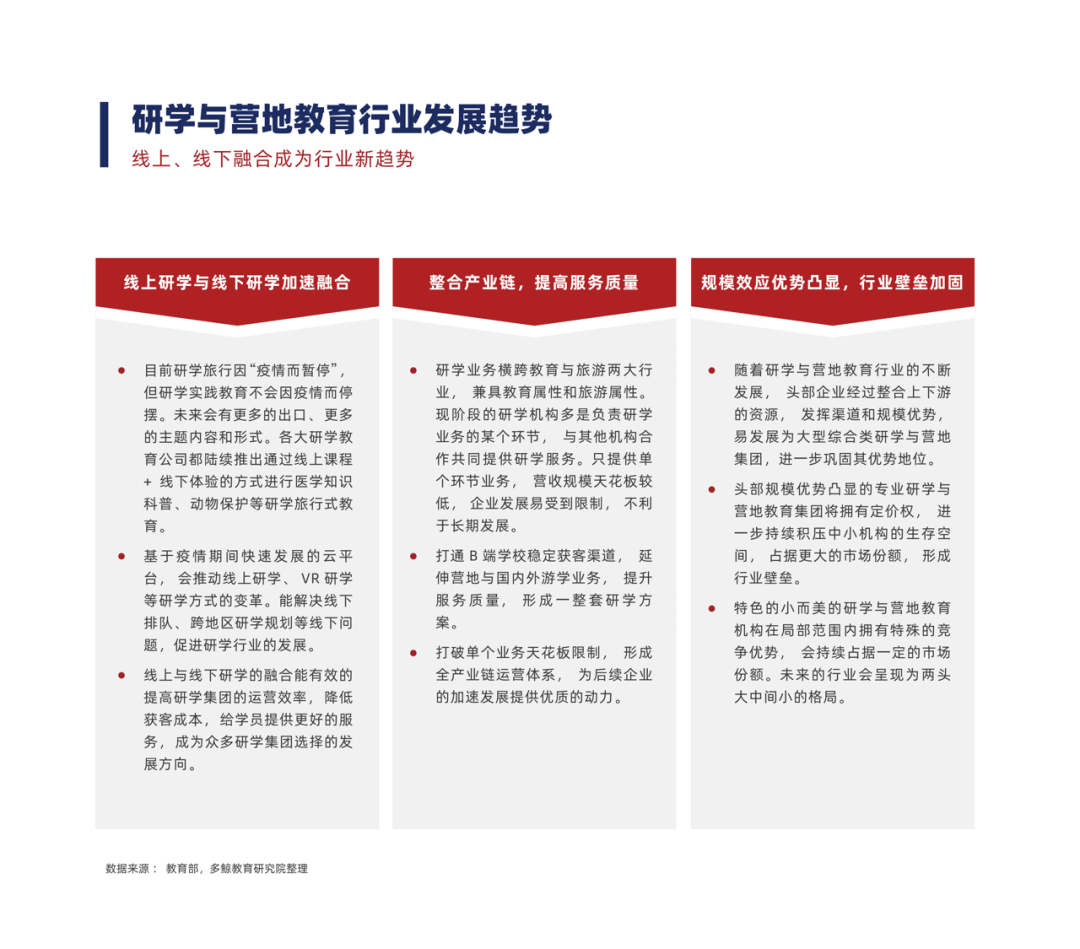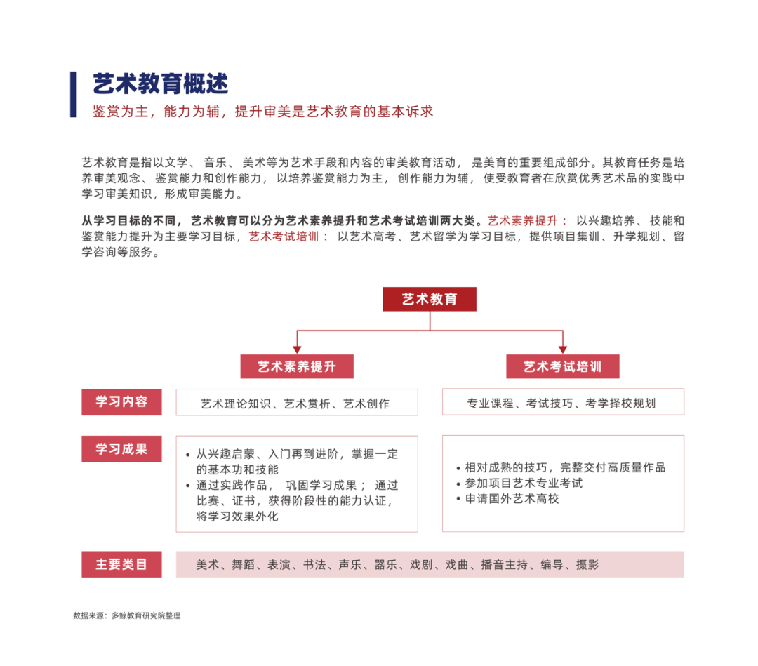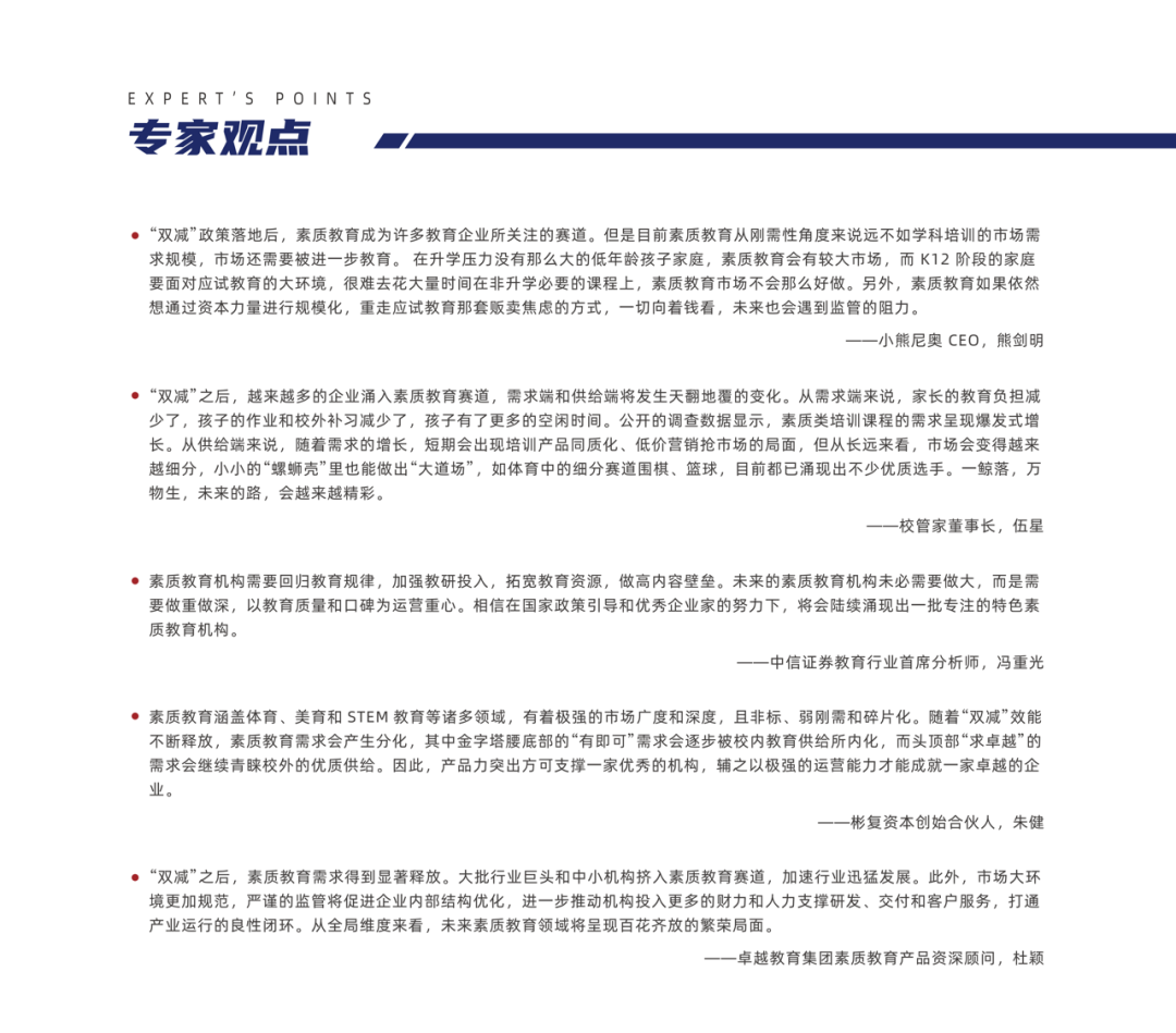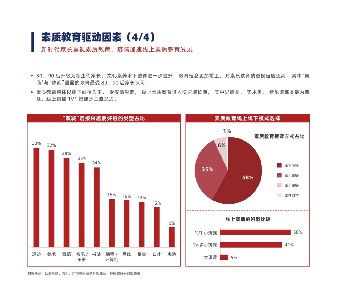 2022 年 1 月,面对行业全新阶段,多鲸教育研究院出品了《2022 中国素质教育行业报告》,报告深入研究一系列政策对素质教育行业的影响,阐明素质教育行业的驱动因素、分析商业模式、拆解产业链,并对如艺术教育、体育教育、STEAM 教育、研学与营地教育多个素质教育典型赛道进行市场特点探究、市场规模测算、竞争格局剖析和典型企业案例分析。此外,报告通过访谈多位业内专家,集素质教育公司创始人、行业投资人、券商分析师观点,多视角、多维度地预判素质教育的未来发展趋势。