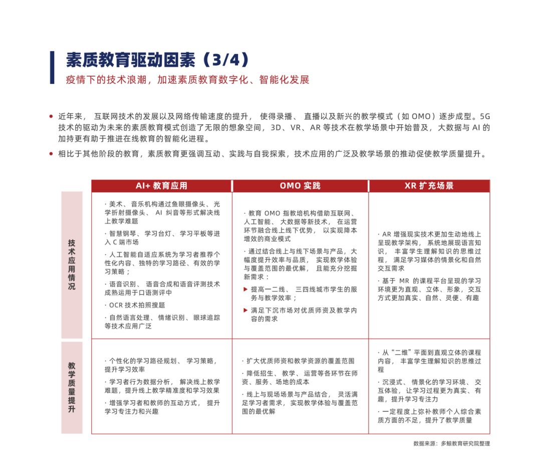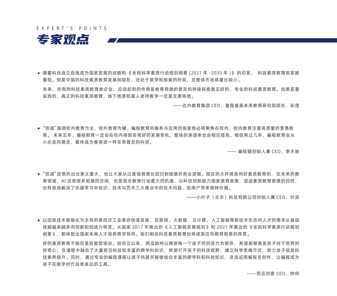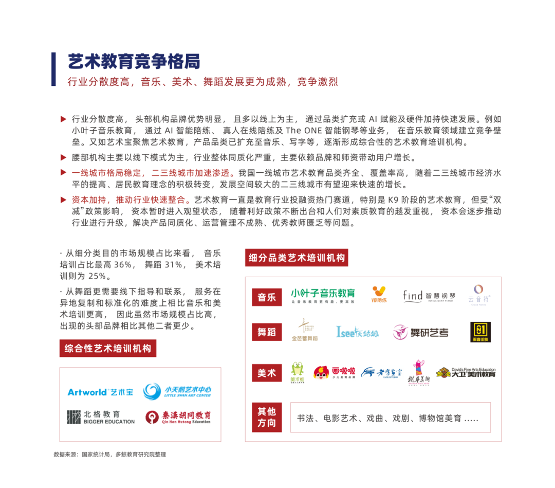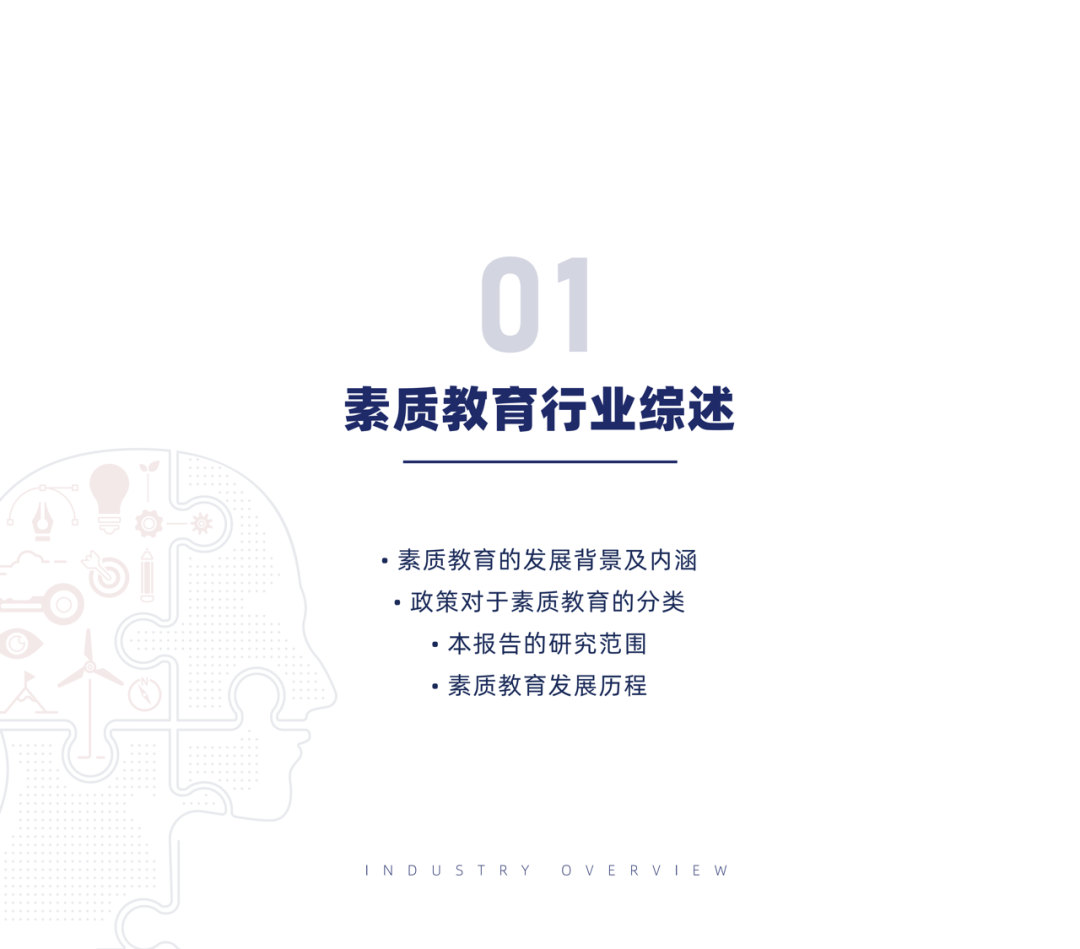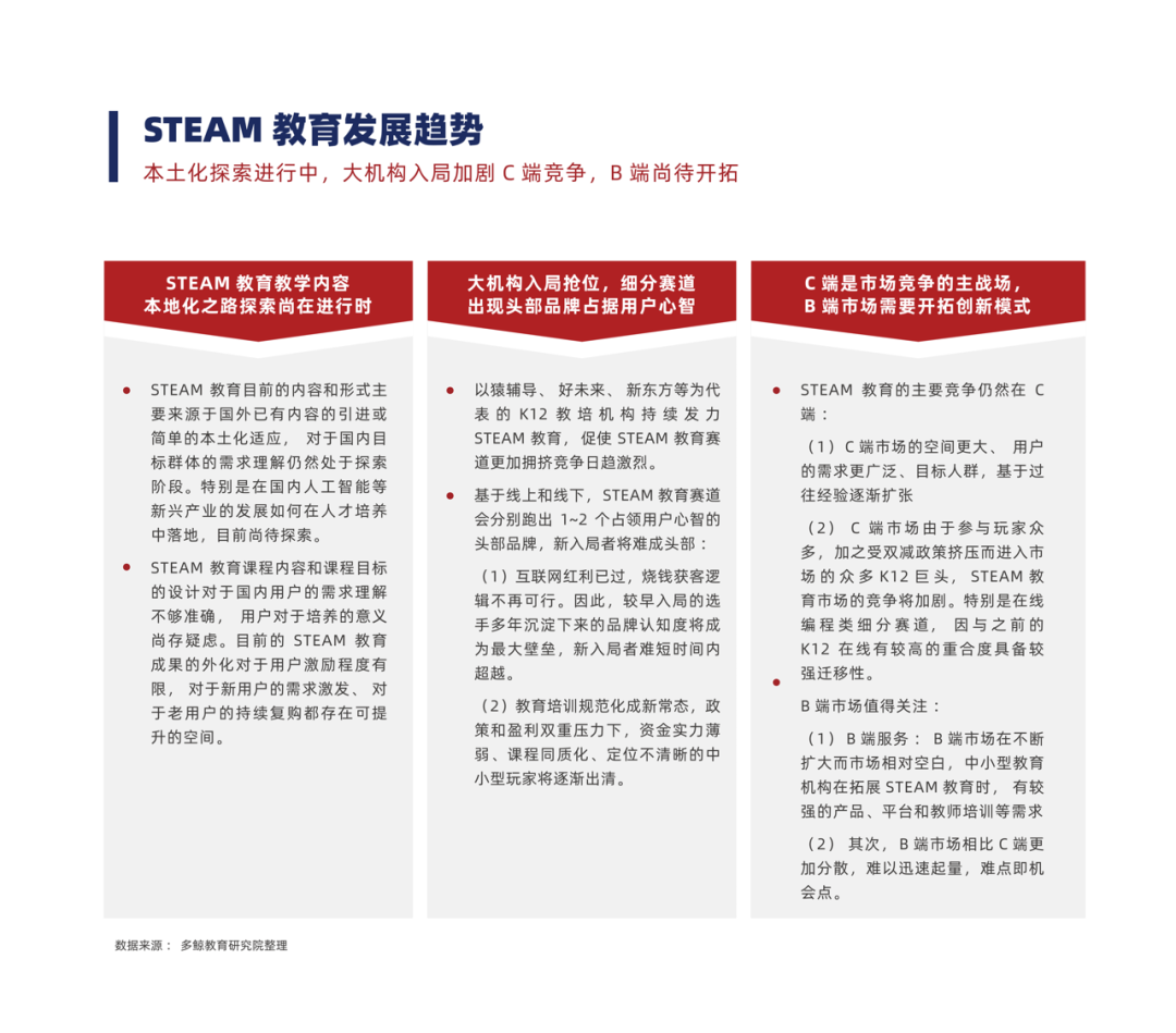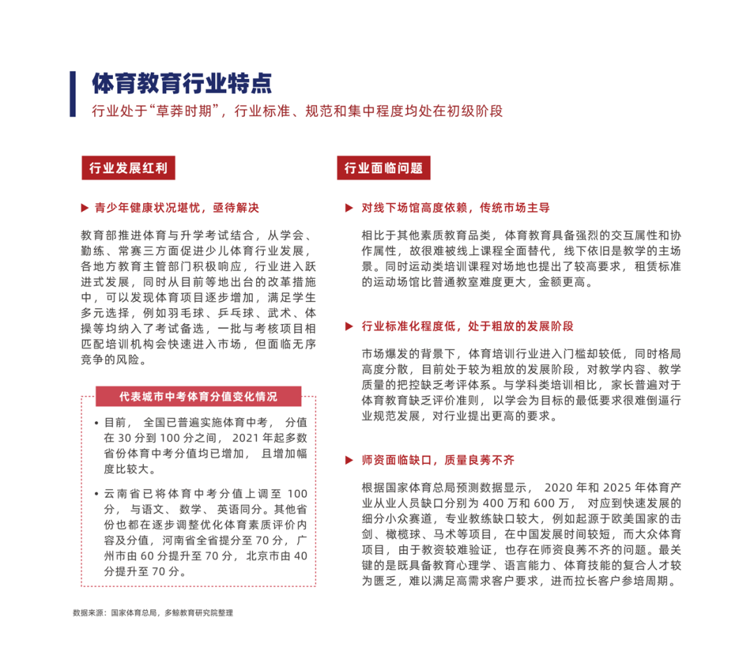 2022 年 1 月,面对行业全新阶段,多鲸教育研究院出品了《2022 中国素质教育行业报告》,报告深入研究一系列政策对素质教育行业的影响,阐明素质教育行业的驱动因素、分析商业模式、拆解产业链,并对如艺术教育、体育教育、STEAM 教育、研学与营地教育多个素质教育典型赛道进行市场特点探究、市场规模测算、竞争格局剖析和典型企业案例分析。此外,报告通过访谈多位业内专家,集素质教育公司创始人、行业投资人、券商分析师观点,多视角、多维度地预判素质教育的未来发展趋势。