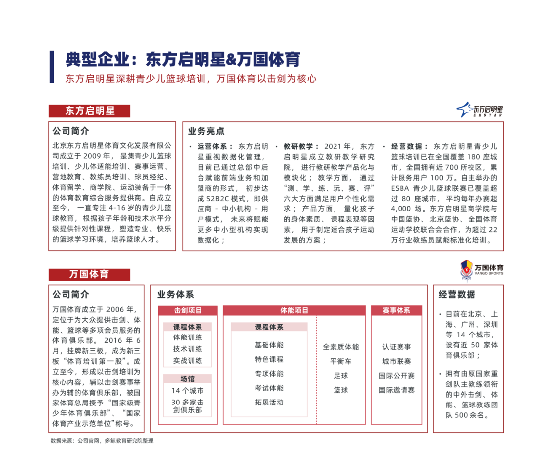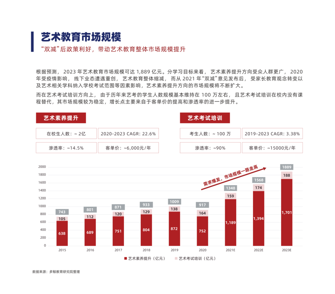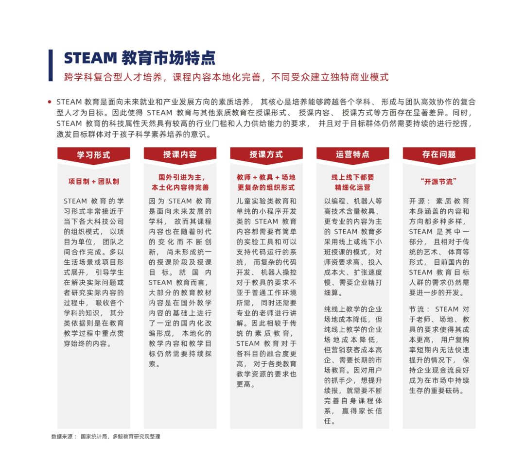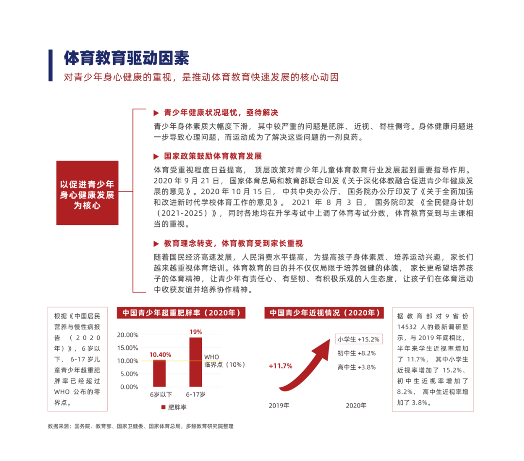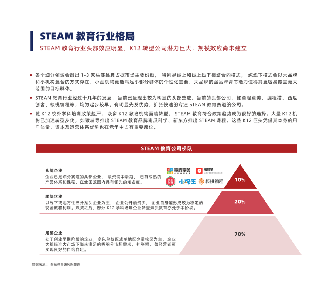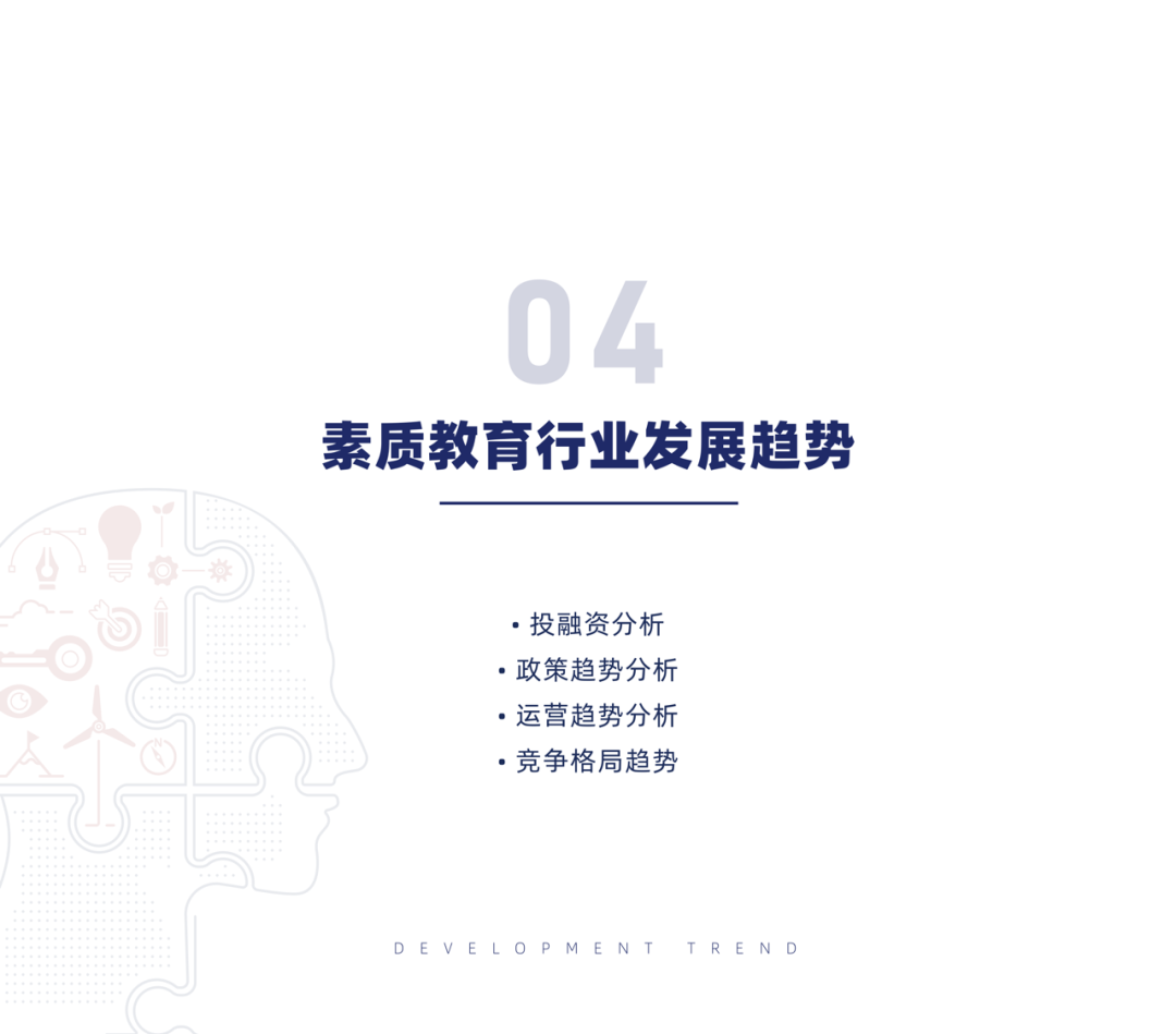 2022 年 1 月,面对行业全新阶段,多鲸教育研究院出品了《2022 中国素质教育行业报告》,报告深入研究一系列政策对素质教育行业的影响,阐明素质教育行业的驱动因素、分析商业模式、拆解产业链,并对如艺术教育、体育教育、STEAM 教育、研学与营地教育多个素质教育典型赛道进行市场特点探究、市场规模测算、竞争格局剖析和典型企业案例分析。此外,报告通过访谈多位业内专家,集素质教育公司创始人、行业投资人、券商分析师观点,多视角、多维度地预判素质教育的未来发展趋势。