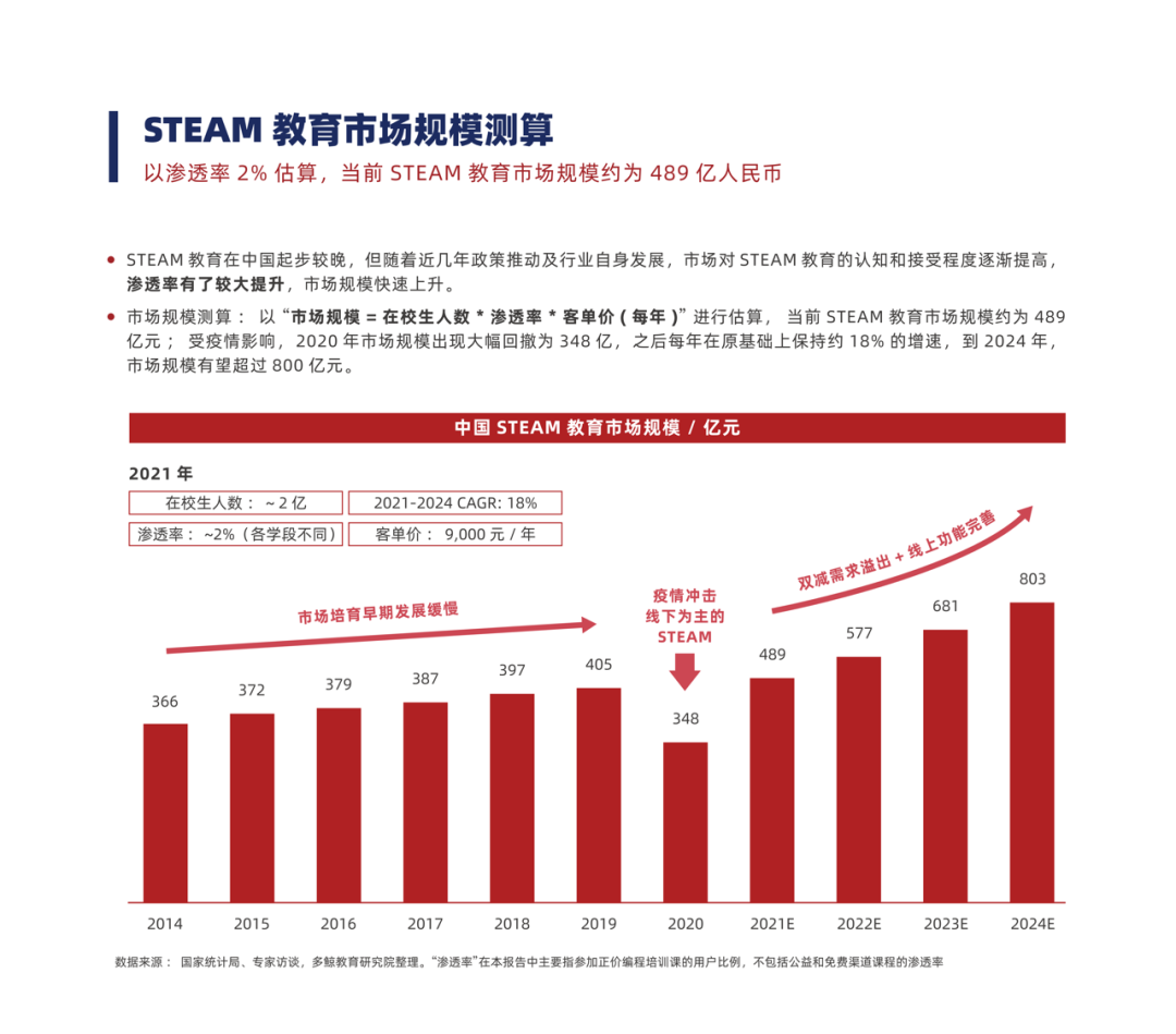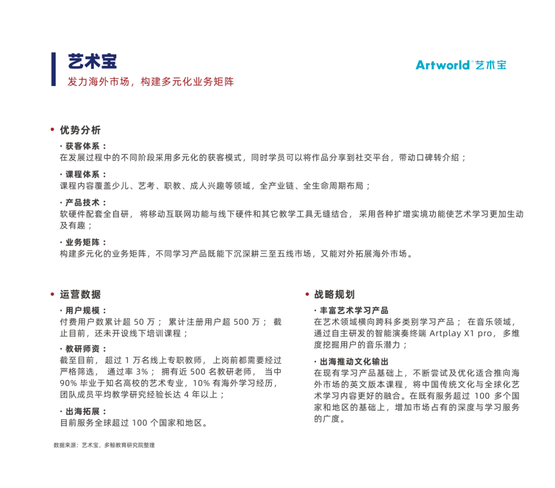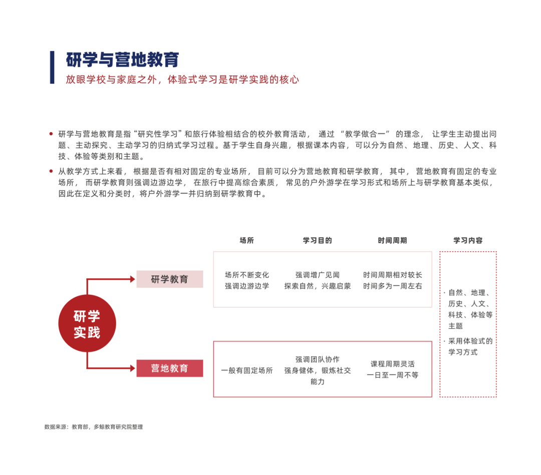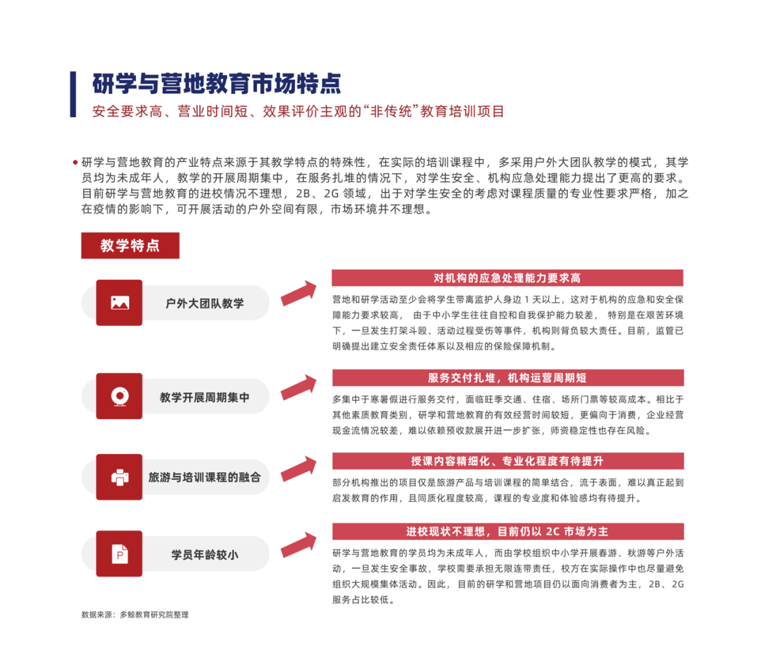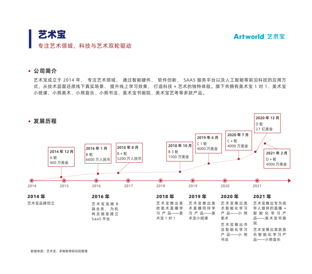 2022 年 1 月,面对行业全新阶段,多鲸教育研究院出品了《2022 中国素质教育行业报告》,报告深入研究一系列政策对素质教育行业的影响,阐明素质教育行业的驱动因素、分析商业模式、拆解产业链,并对如艺术教育、体育教育、STEAM 教育、研学与营地教育多个素质教育典型赛道进行市场特点探究、市场规模测算、竞争格局剖析和典型企业案例分析。此外,报告通过访谈多位业内专家,集素质教育公司创始人、行业投资人、券商分析师观点,多视角、多维度地预判素质教育的未来发展趋势。