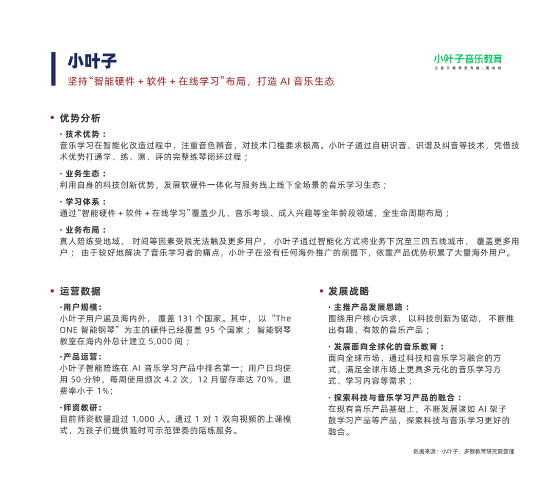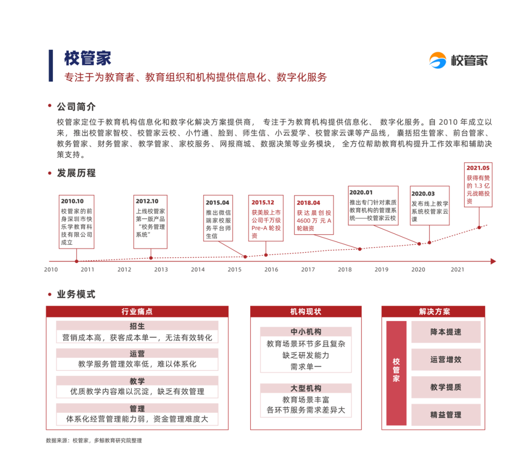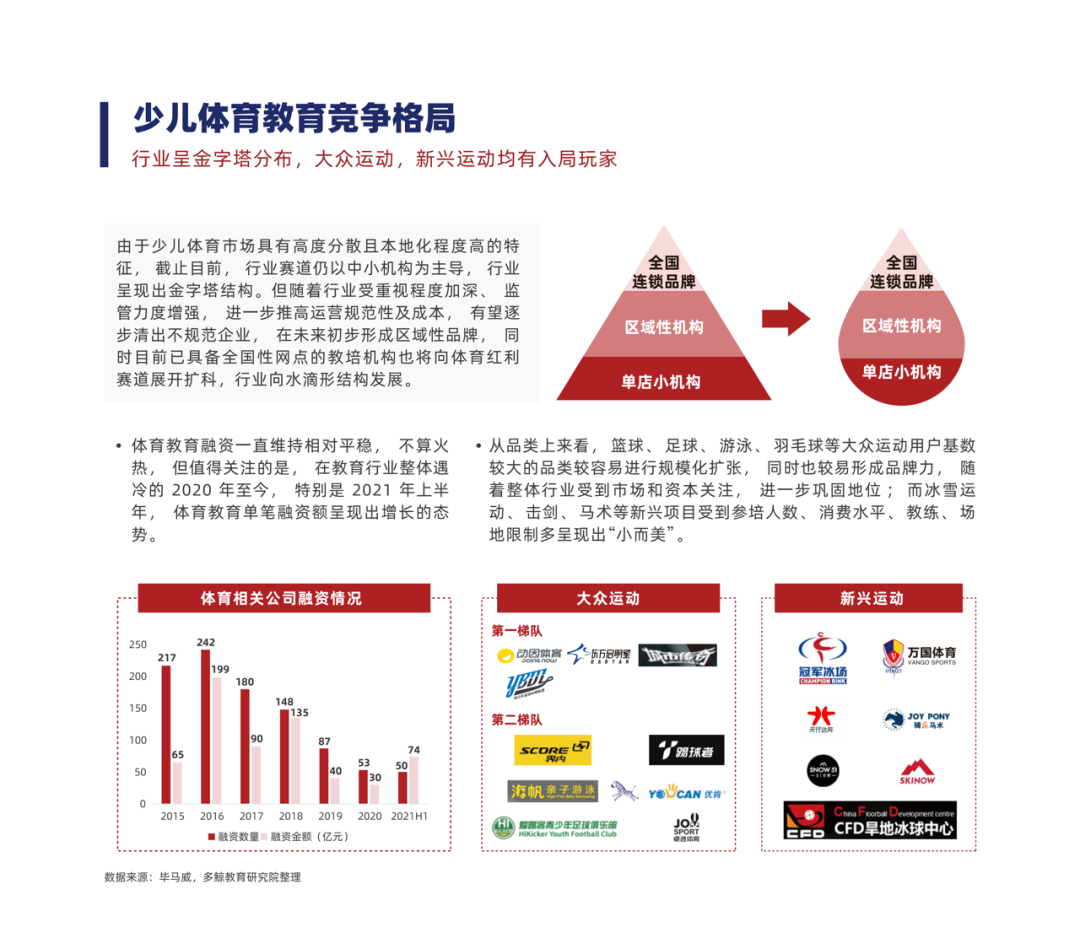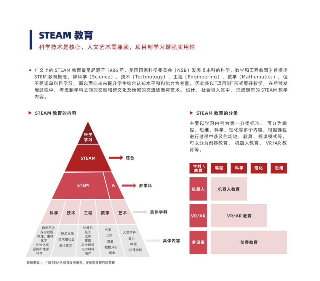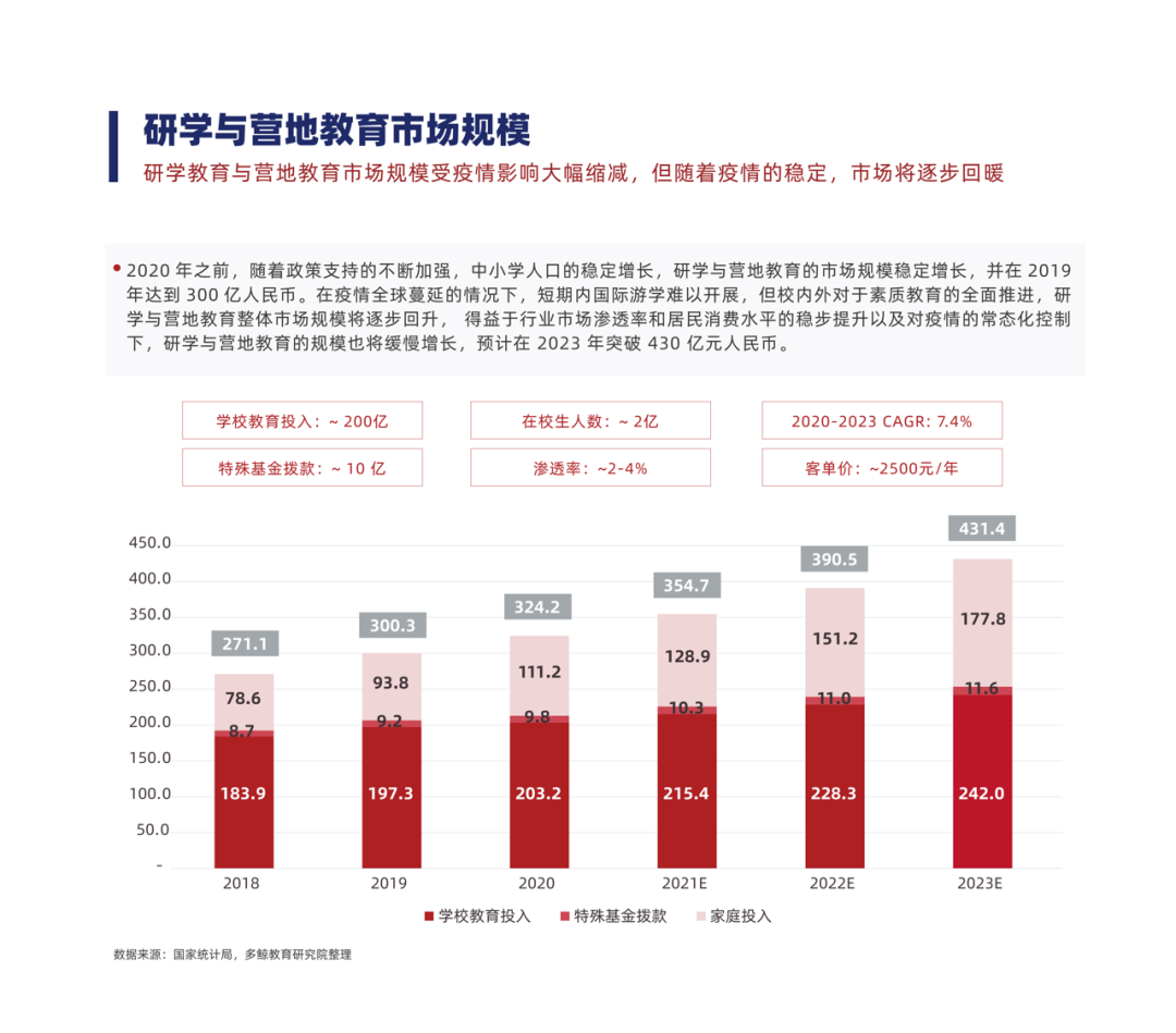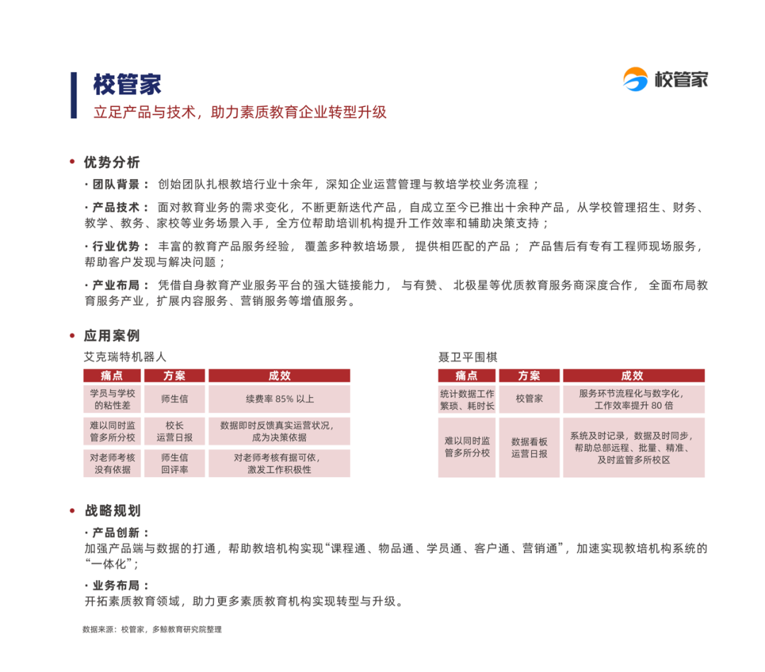 2022 年 1 月,面对行业全新阶段,多鲸教育研究院出品了《2022 中国素质教育行业报告》,报告深入研究一系列政策对素质教育行业的影响,阐明素质教育行业的驱动因素、分析商业模式、拆解产业链,并对如艺术教育、体育教育、STEAM 教育、研学与营地教育多个素质教育典型赛道进行市场特点探究、市场规模测算、竞争格局剖析和典型企业案例分析。此外,报告通过访谈多位业内专家,集素质教育公司创始人、行业投资人、券商分析师观点,多视角、多维度地预判素质教育的未来发展趋势。