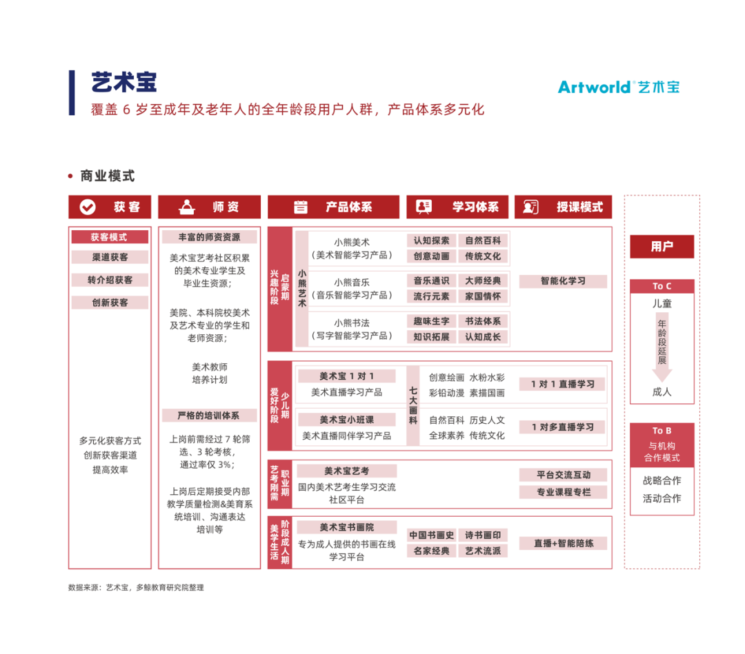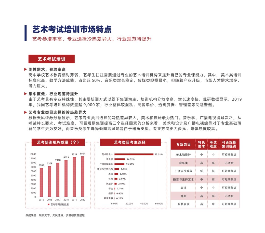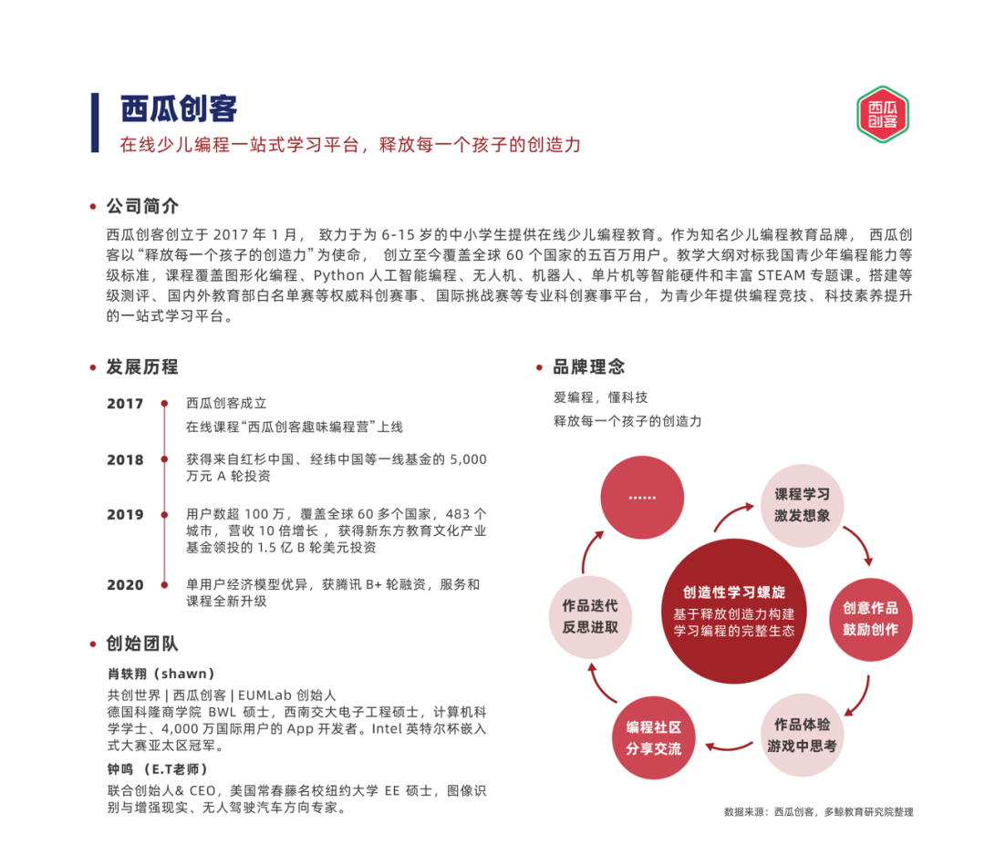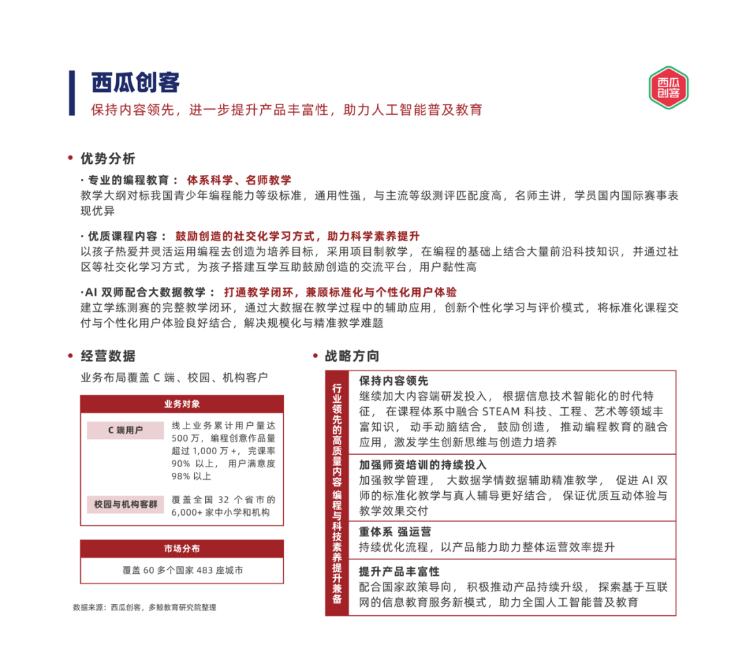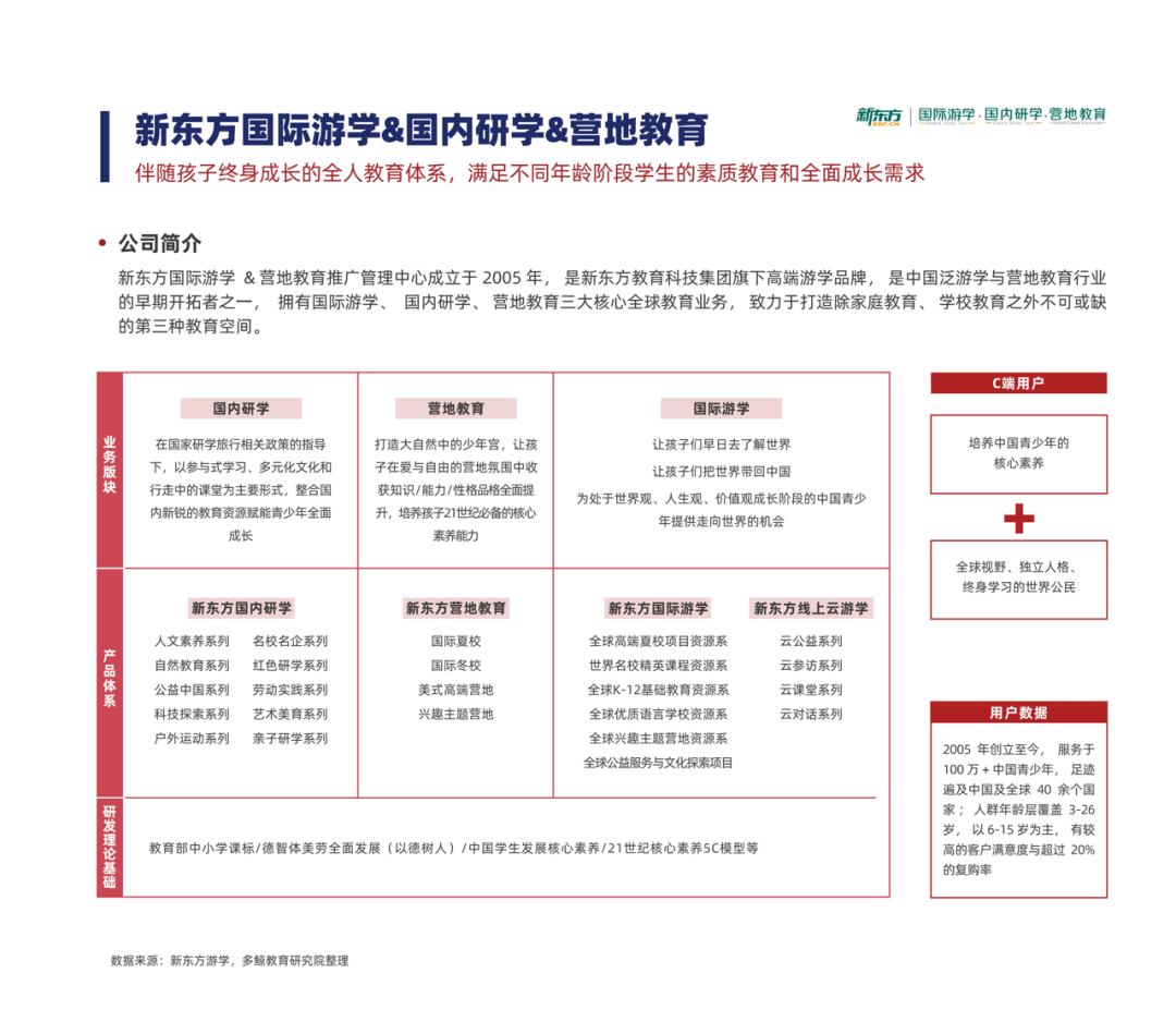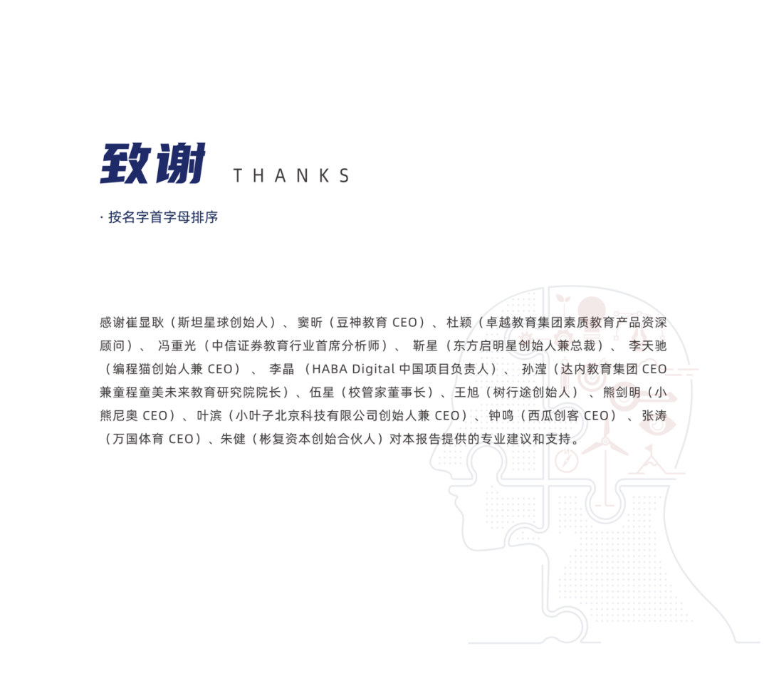 2022 年 1 月,面对行业全新阶段,多鲸教育研究院出品了《2022 中国素质教育行业报告》,报告深入研究一系列政策对素质教育行业的影响,阐明素质教育行业的驱动因素、分析商业模式、拆解产业链,并对如艺术教育、体育教育、STEAM 教育、研学与营地教育多个素质教育典型赛道进行市场特点探究、市场规模测算、竞争格局剖析和典型企业案例分析。此外,报告通过访谈多位业内专家,集素质教育公司创始人、行业投资人、券商分析师观点,多视角、多维度地预判素质教育的未来发展趋势。