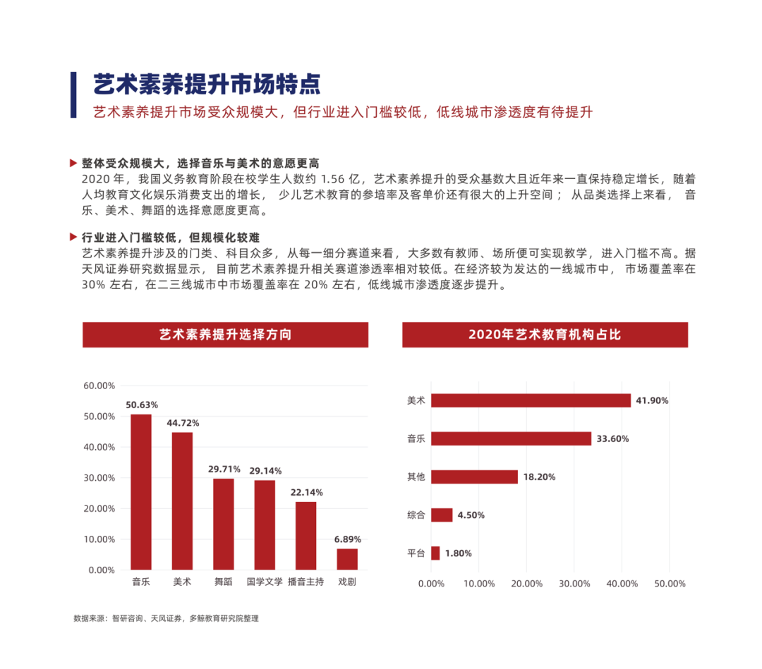 「双减」之下,教育行业巨变。K12 学科培训业务退潮,素质教育赛道回暖。在政策呼吁和形势引领下,一批企业加速入场。据央视报道显示,「双减」政策发布一月余,国内艺术类、体育类培训机构新增 3.3 万余家,同比暴增 99%。投资者们甚至在 A 股市场炒出素质教育概念股。