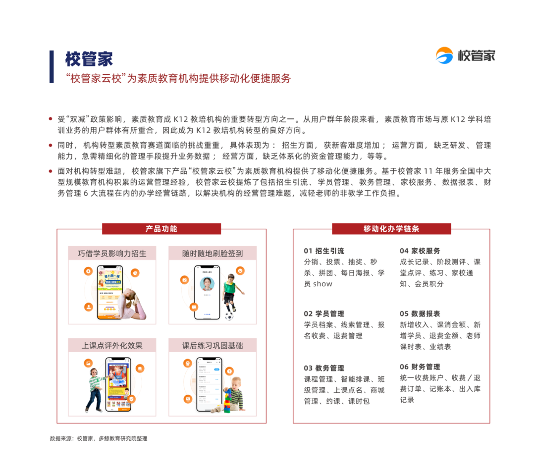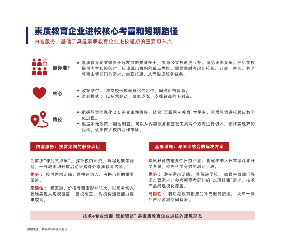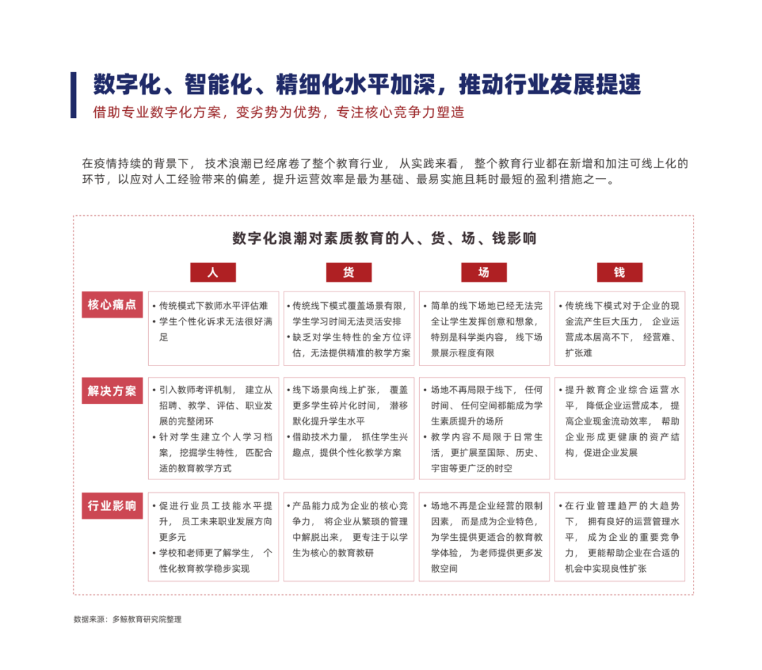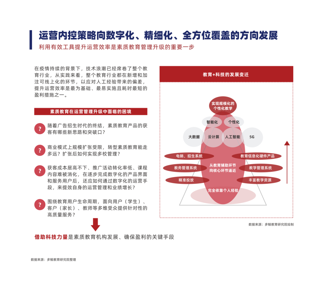 然而,素质教育的发展,仍面临重重挑战:当监管政策趋严,素质教育机构如何合规、有序发展?当疯狂烧钱获客的时代终结,素质教育产品有哪些获客新思路和突破口?当技术浪潮席卷教育行业,素质教育机构如何应对供需两端的丰富变化?当刚性需求增强,素质教育企业要做校内教育的有益补充,如何找准进校切入点?当行业竞争加剧,素质教育机构如何提高综合能力、走得更远?