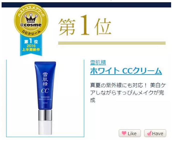 推荐理由:懒到极致的CC霜,集美容液、乳液、面霜、防晒霜、妆前乳、粉底,6大功效为一体。