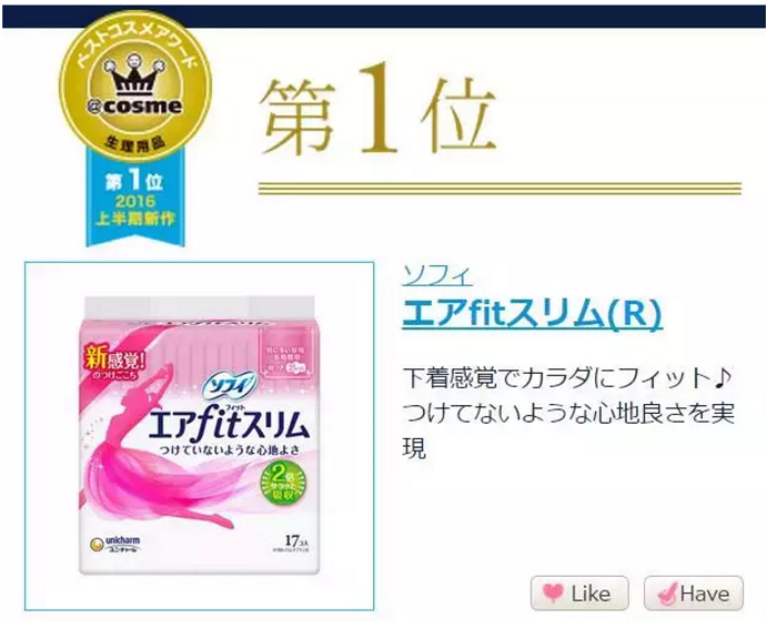 推荐理由:新感觉姨妈巾,表面柔软,犹如和内内结合在一起的零触感,瞬间吸收,表面持续干爽。这是刚需没法省。