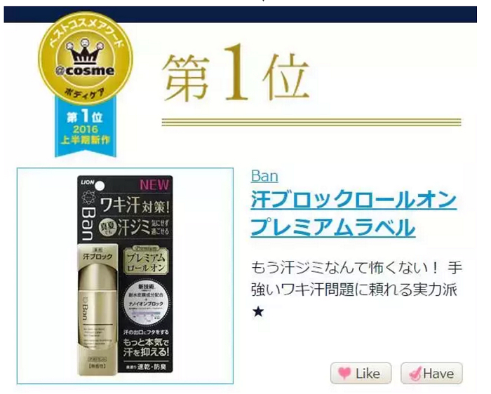 推荐理由:滚珠式止汗剂(加强版),独家耐水膜技术,可有效抑制腋下出汗,异味,并有杀菌成分。效果可持续一整天!夏天你不会想省下这个。