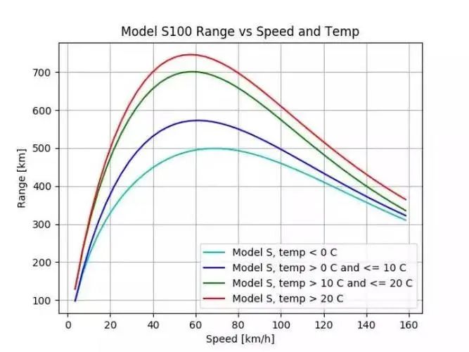 对此,特斯拉曾做过一组专项数据统计,测试结果表明60km/h是特斯拉能实现最长续航的时速值,若平均时速越高,车辆实际续航会阶梯型递减。