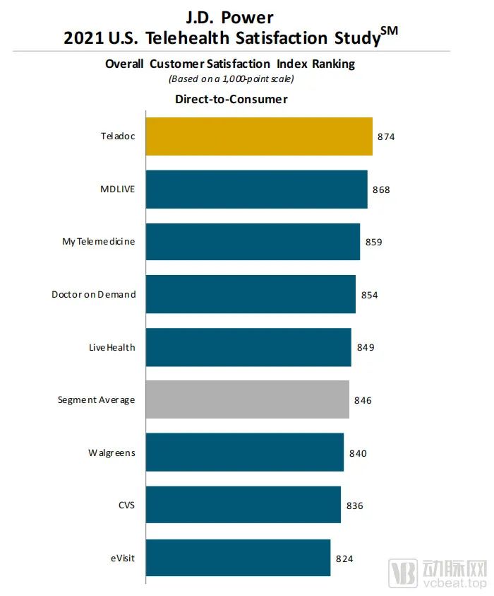 除了自身的产品方案以外,得益于会员数量的持续增长,Livongo收集的数据量也水涨船高。截至2021年第三季度,Livongo已经累计收集到19.9亿条数据。这些数据的累积也会成为今后Teladoc重要的竞争力。正是靠着这样的竞争力,Teladoc 在 JD Power 2021 美国远程医疗满意度研究中在直接面向消费者的供应商中排名最高,比类别平均水平高出近30分。