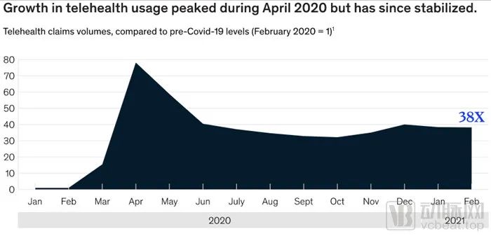 首先是消费者需求层面,根据麦肯锡的一份报告显示,在2020年4月,新冠疫情袭击全球之后仅仅两个月,远程医疗利用率就比2020年2月高出78倍。即便是疫情相对稳定的现阶段,远程医疗利用率也稳定在疫情前38倍的水平。有大约40%的消费者认为远程医疗是他们未来护理需求的一个重要方式,这一数据在新冠之前,只有11%。