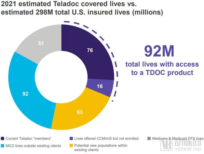 从Teladoc的角度看,这笔收购也是非常划算的。截至2021年,美国共有约2.98亿人口被医疗保险覆盖。Teladoc已经通过保险公司和各种渠道商为其中7600万人提供服务,另外还有1600万人可能发展成为慢性病管理业务的客户,也就是说目前有9200万人(约占美国被保险人的31%)可以使用Teladoc的产品。此外,还有约6300万潜在客户可以从现有客户、管理型医疗机构和医疗保险及医疗补助收费服务中获得。因此,Livongo的并入对于Teladoc会员的增加是有正向帮助的。