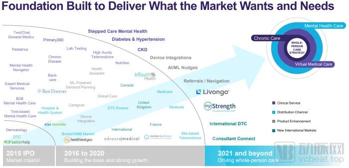 顺带提一句,Teladoc对于收购来的包括Livongo在内的业务模块还在继续整合中,未来将形成以用户个人健康为中心的,集在线问诊、慢病与心理健康管理等多种服务为一体的互联网医疗平台。