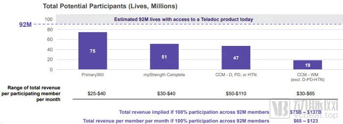 此外,Teladoc认为目前使用其服务的9200万客户中,至少有750亿美元的年收入机会。如果客户选择在Teladoc的服务组合中采用多种产品,营收还会有显著的上升,乐观估计能达到1370亿美元。