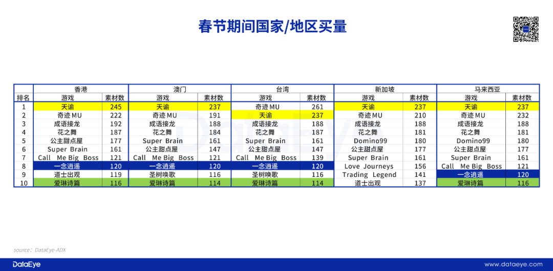 买量现象1:出海游戏霸占了一定份额。5个国家/地区的榜单在春节假期7天的投放排名大同小异,《爱琳诗篇》《一念逍遥》《圣树唤歌》《花之舞》等国产游戏分别进入这些市场的投放榜单,《天谕》更是在除台湾以外的4个国家/地区位列第一。