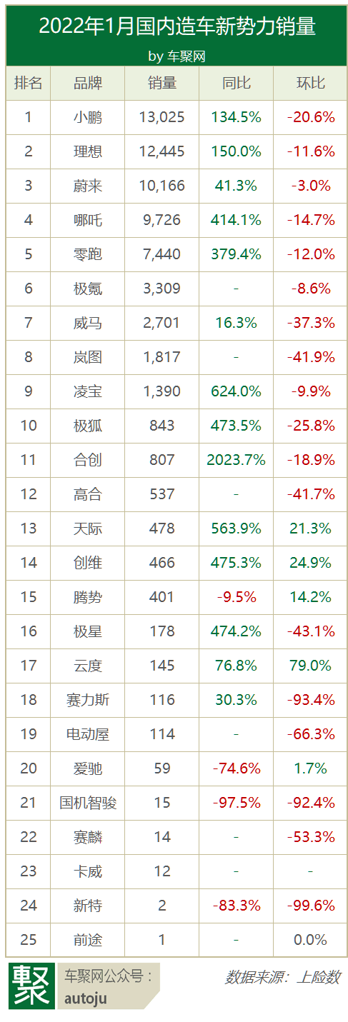 车聚君用热乎的数据,赶紧列了一张更全的新势力销量表,共25家。其中有一些有意思的「点」,愿意和大家一起品读。