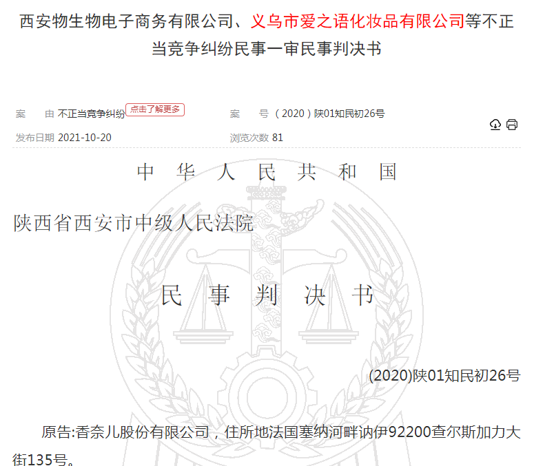 在一审判决中,陕西省西安市中级人民法院经审理认为:物生物公司的销售行为及爱之语公司的生产行为均对香奈儿公司构成了不正当竞争,应承担停止侵权的责任。并判决物生物公司、爱之语公司立即停止销售相关商品;爱之语公司赔偿香奈儿公司损失及合理开支60万元。