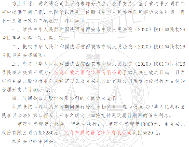 最终,陕西省高级人民法院判决爱之语公司赔偿香奈儿公司40万元人民币以及一审二审案件部分受理费,赔偿额较一审少了20万。