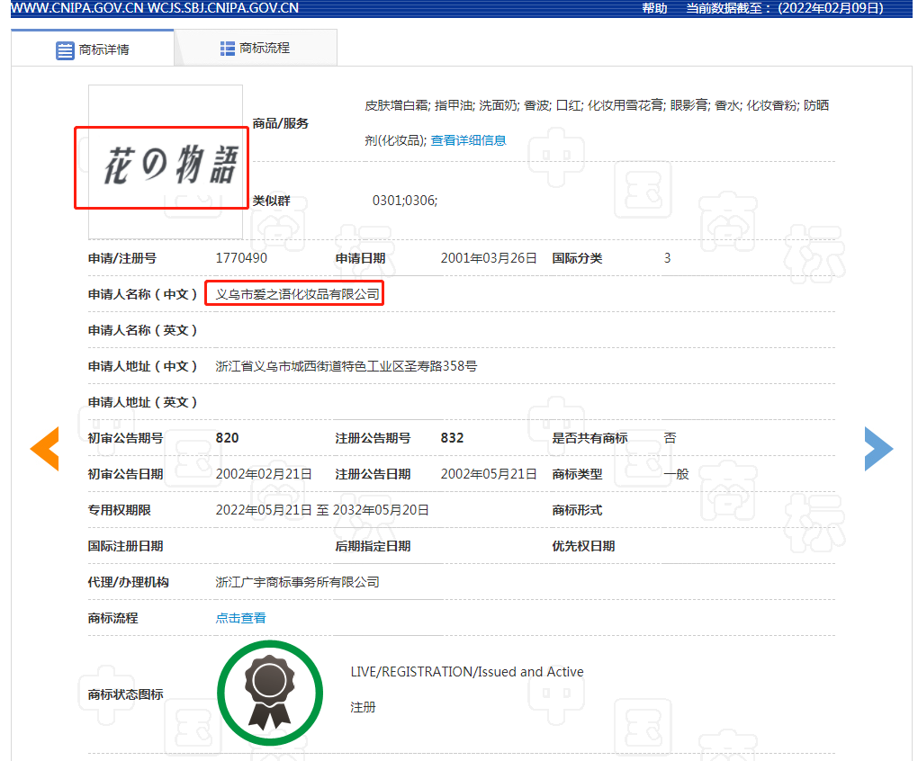 据国家企业信用信息公示系统显示,爱之语公司成立于2002年03月,花之物语(即花の物语)的第3类商标即归属于爱之语公司。