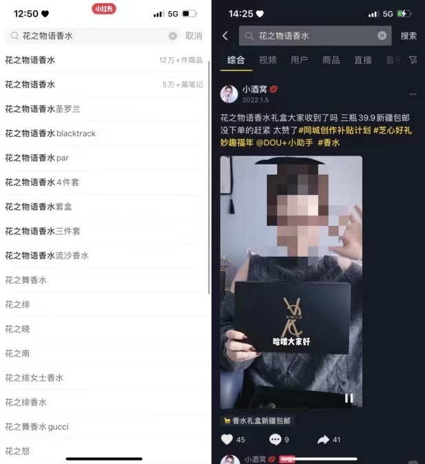 青眼在小红书上以“花之物语香水”为关键词检索,共关联5万+篇笔记,12万+件商品;此外,在抖音平台上,也有多个账号推广花之物语香水产品。