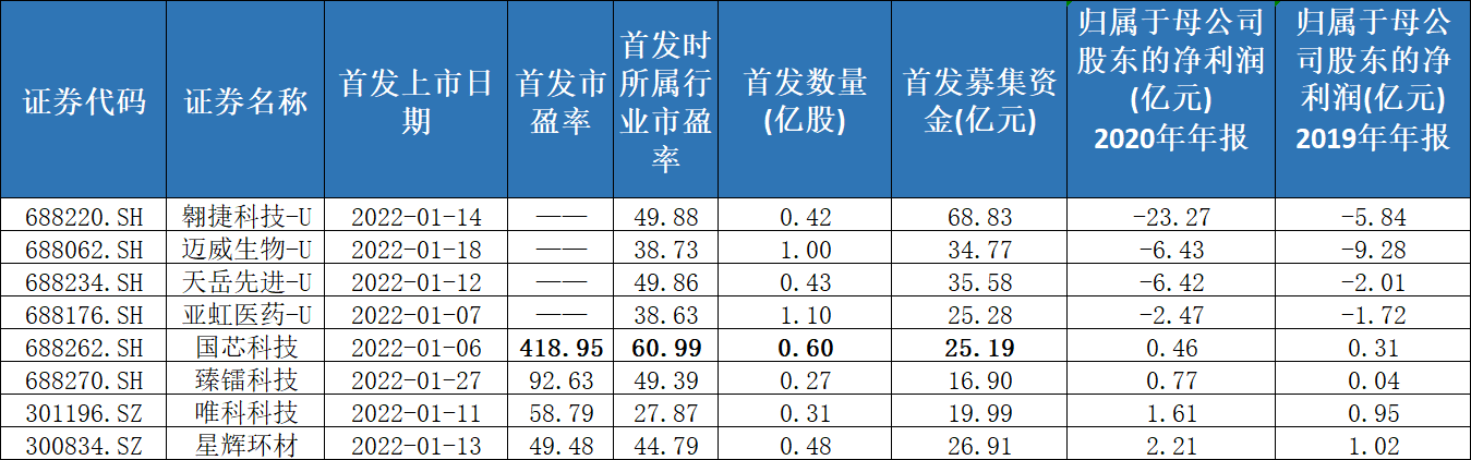 - 国芯科技(688262.SH)于2022年1月6日上市,首发价格接近42元/股,上市当日最高跌去近1元/股,跌幅仅超2%。截至2月11日,其收盘价距离首发价格已跌去超2.6元/股,跌幅扩大至6%,中一签持有至2月11日亏损0.13万元。