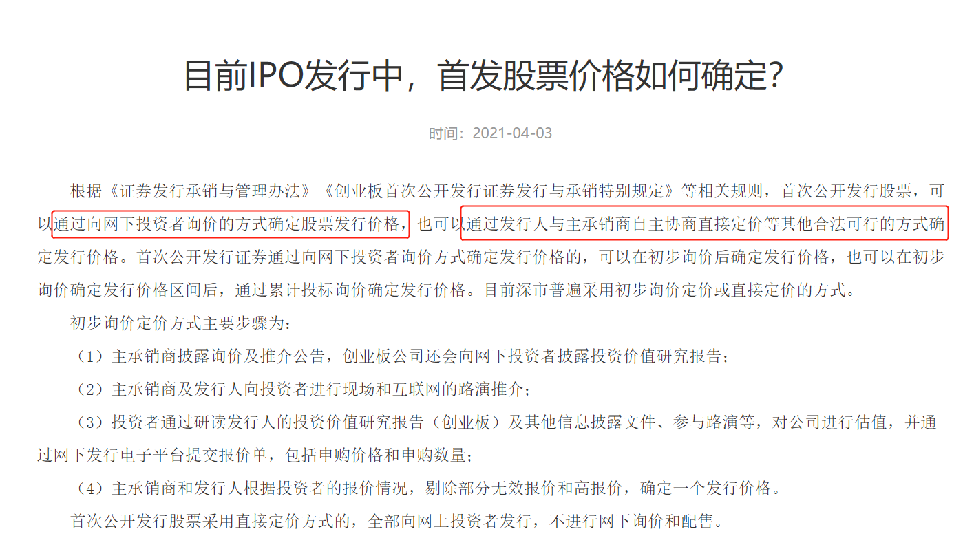 直接定价和询价的区别在于,发行股本不超过2000万股可由发行人和主承销商直接定价,但价格不能超过同行业平均市盈率。询价定价则是公司IPO发行的股本超过2000万股,可采用此种定价方式。前述董秘表示,一般企业IPO发行股本多超过2000万股,IPO首发股票定价多采用的是询价定价。