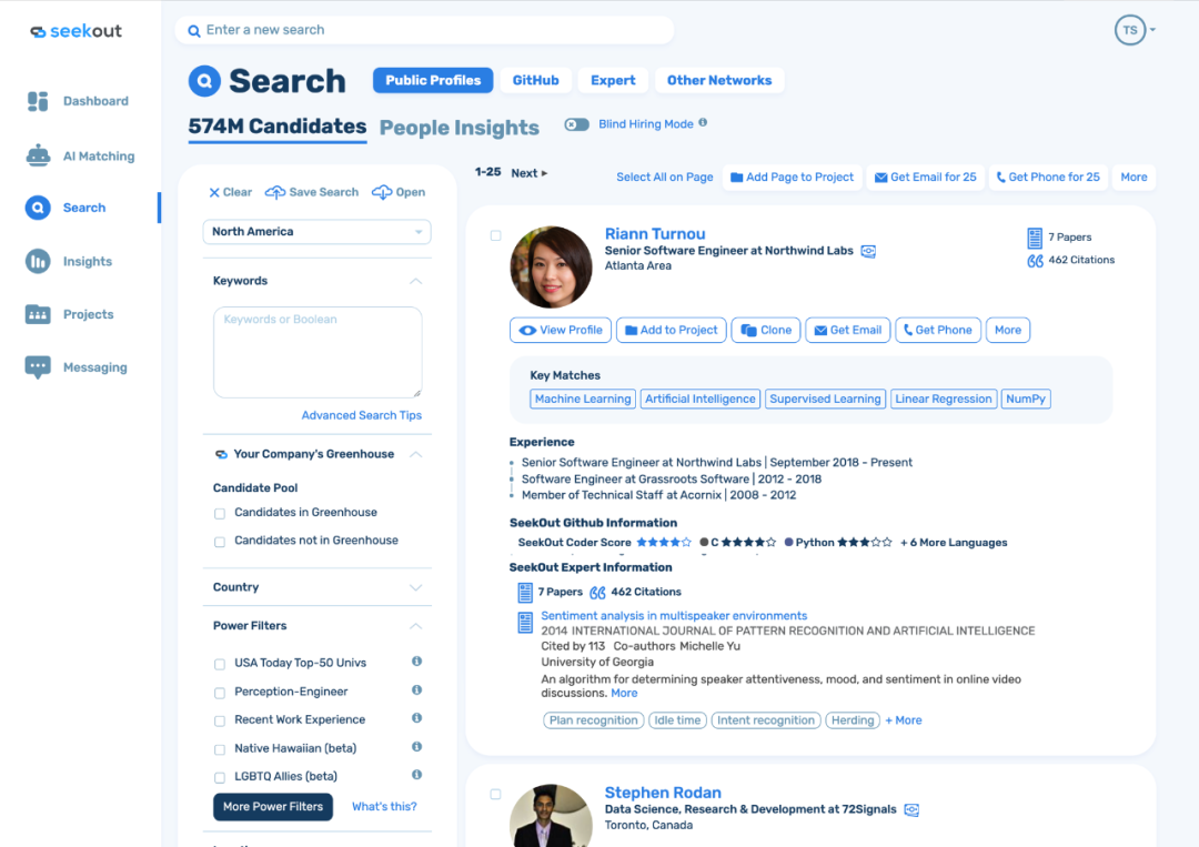 Seekout的主要技术是通过网络上的公开数据、AI赋能的人才搜索引擎和深度互动的分析能力汇集信息,比如网络上的社交账号,GitHub档案,写过的论文、申过的专利、其他同事的推荐和评价等等信息都会被收集其中,从而为每一位人才打造出360度全方位的深度画像,替雇主在招人方面行使更多的谨慎,而招到与公司和职位完美匹配的人才也就意味着他们日后将更不容易离职,更会忠心为公司卖命。